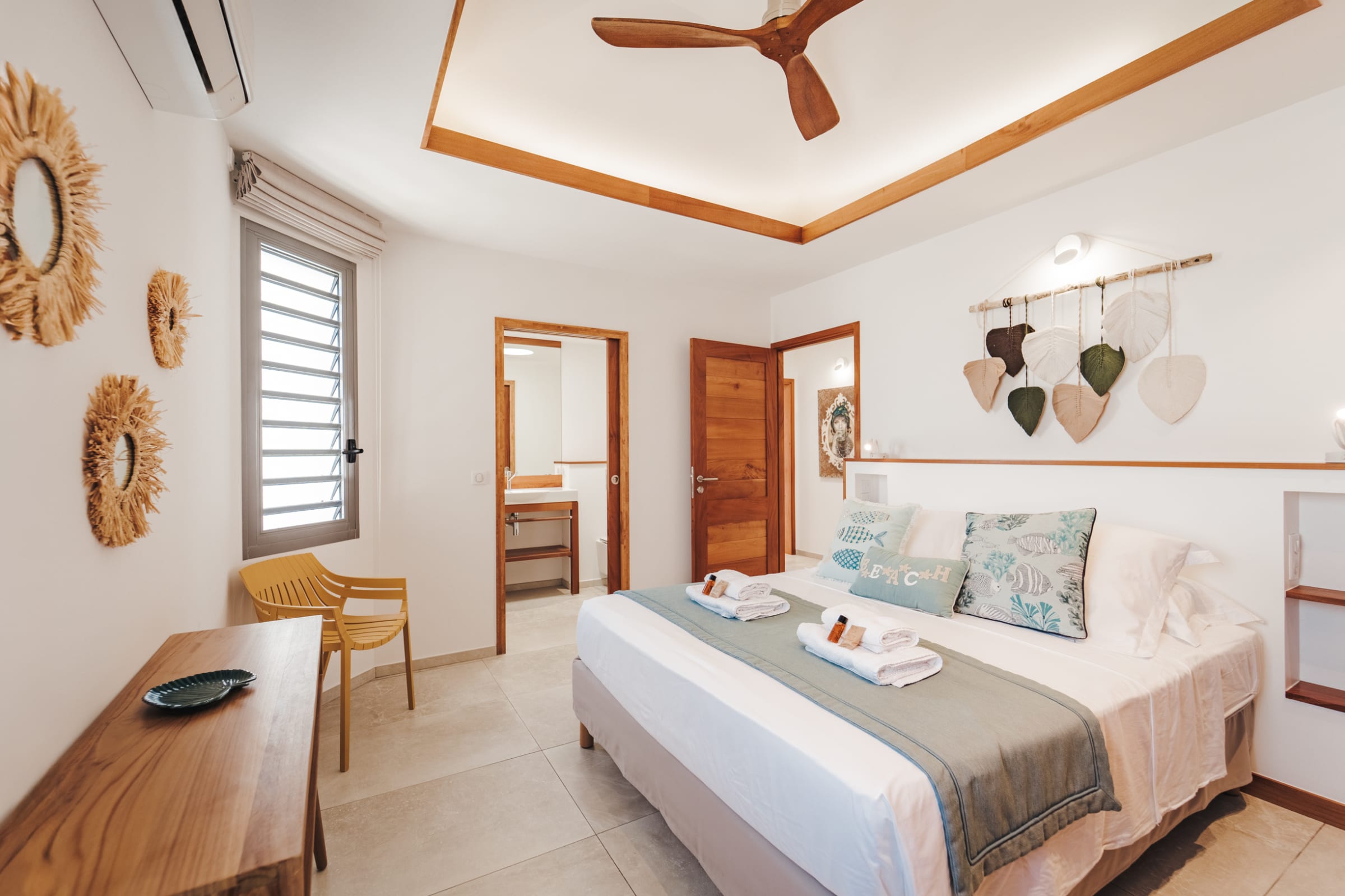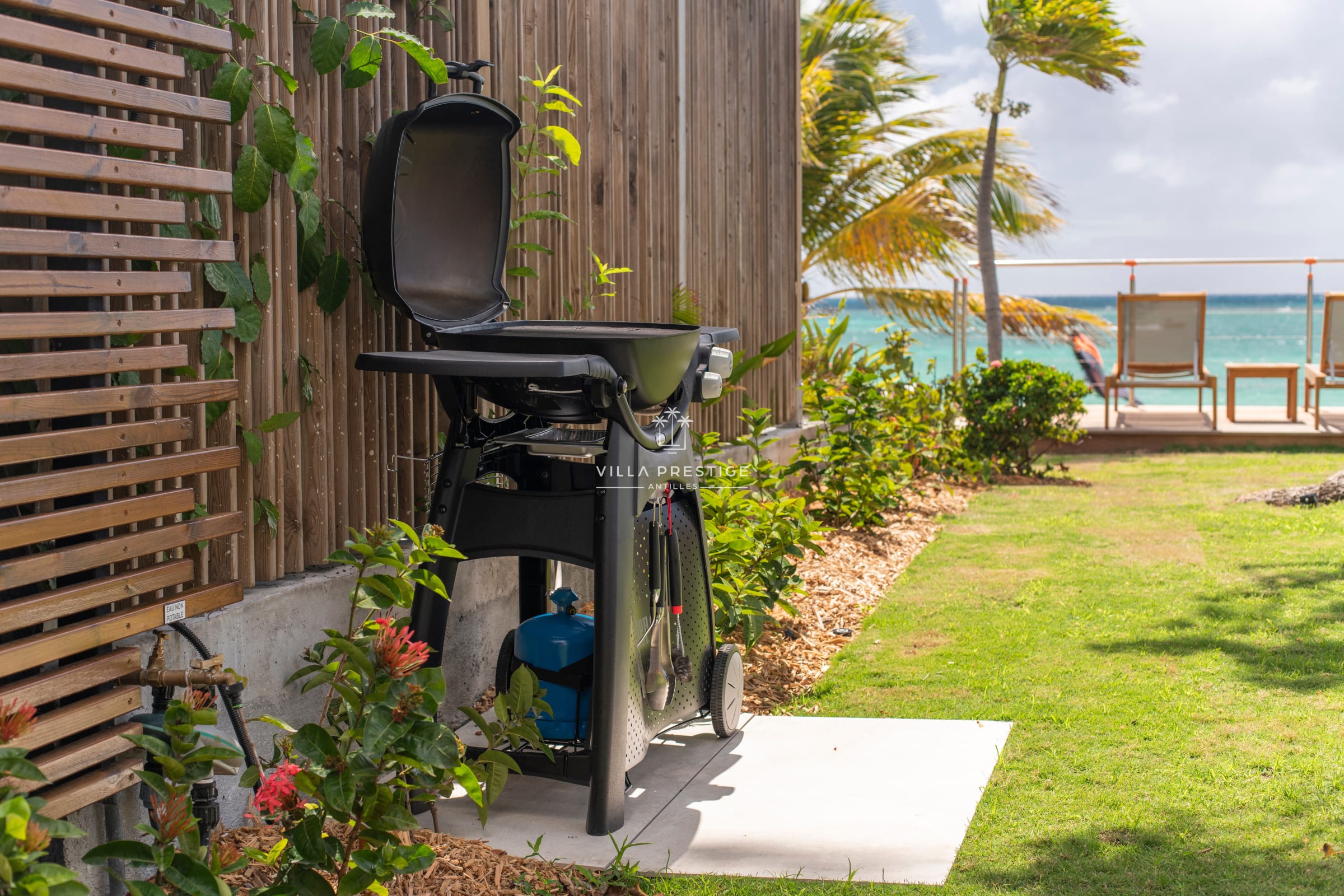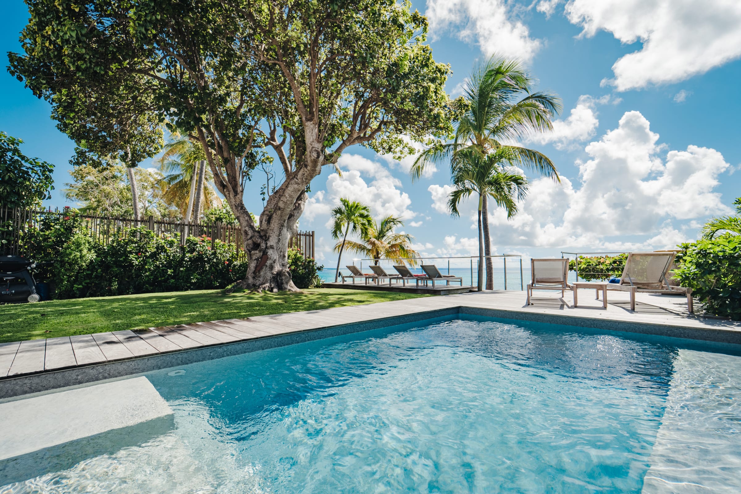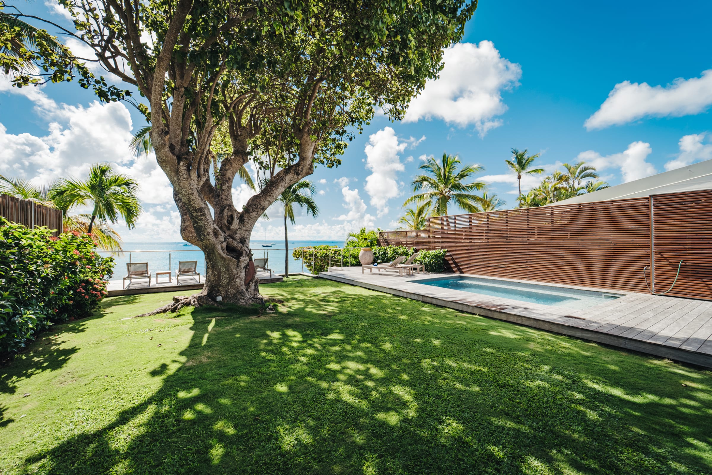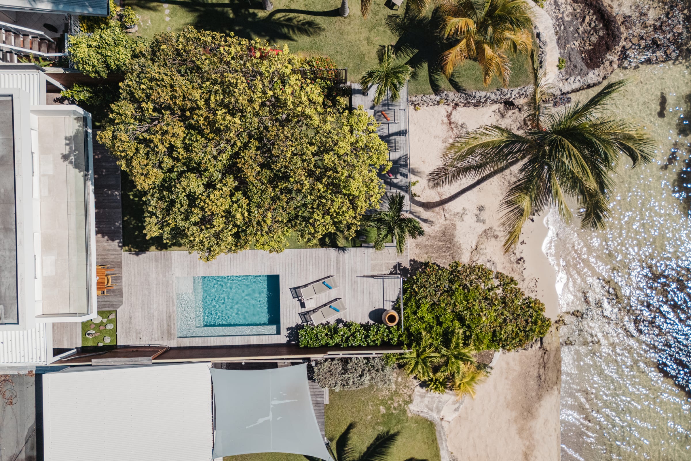 La villa bénéficie d’un jardin ouvert directement sur la plage, avec un majestueux mapou qui offre une ombre bienvenue. La piscine au sel est sécurisée par une barrière amovible. Équipements extérieurs : BBQ gaz, douche extérieure, transats, citerne d’eau. Pour les loisirs : kayak, paddle, plage à vos pieds.