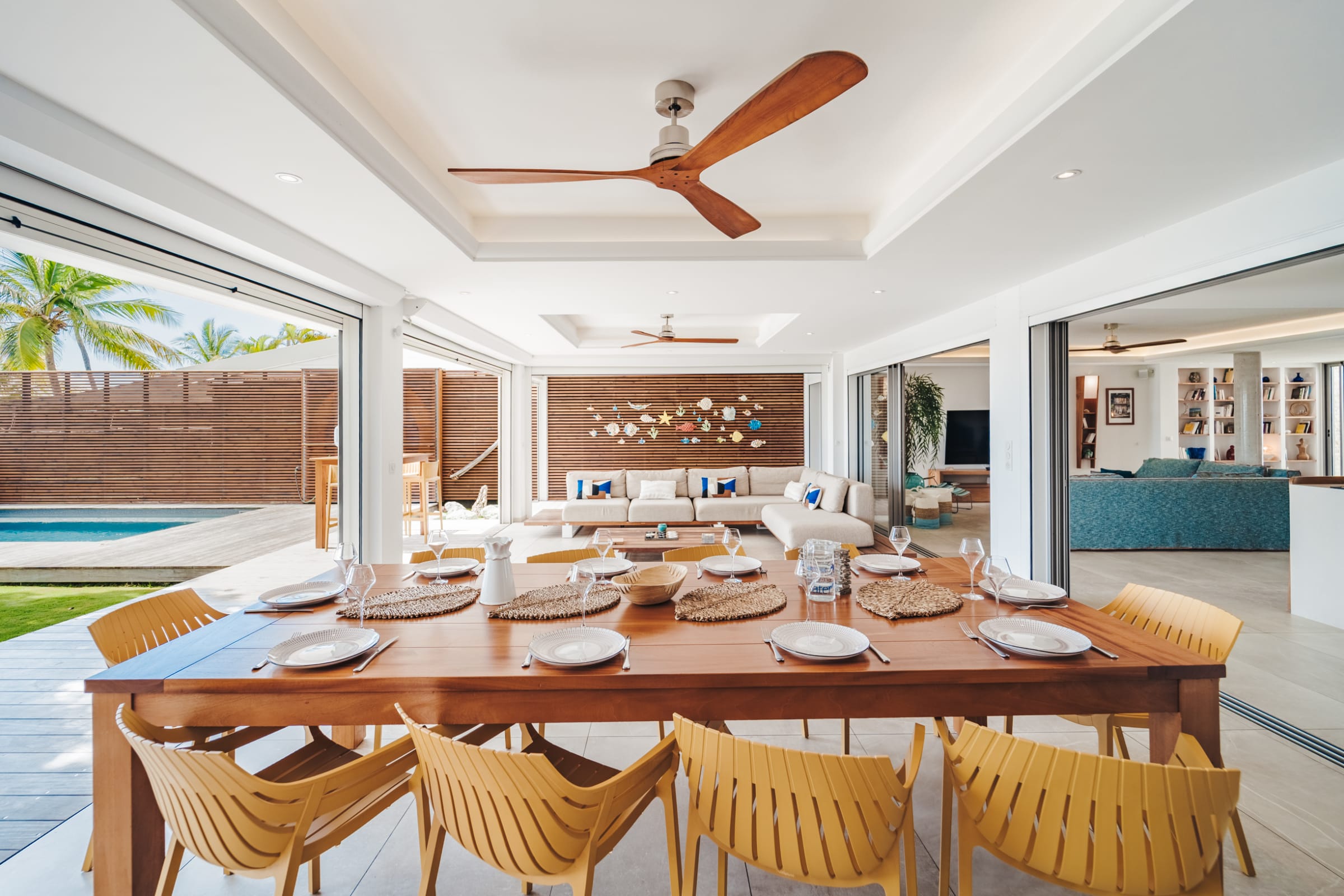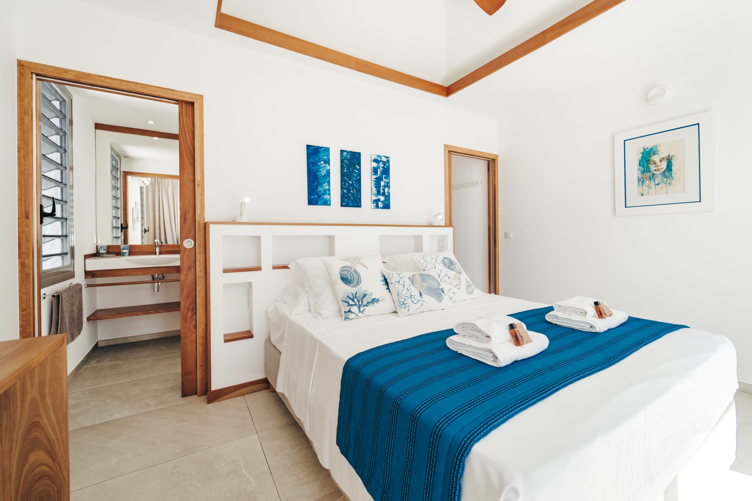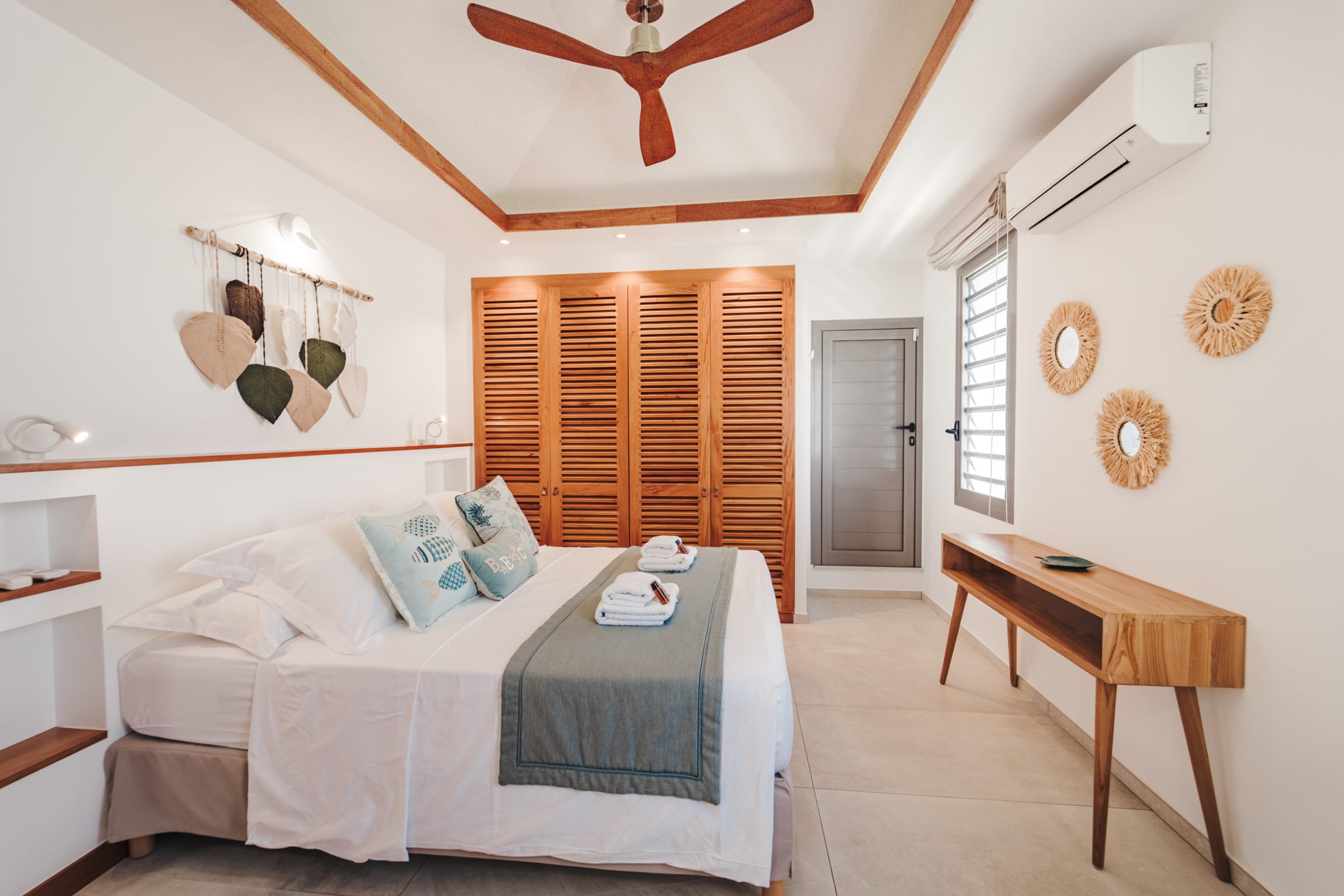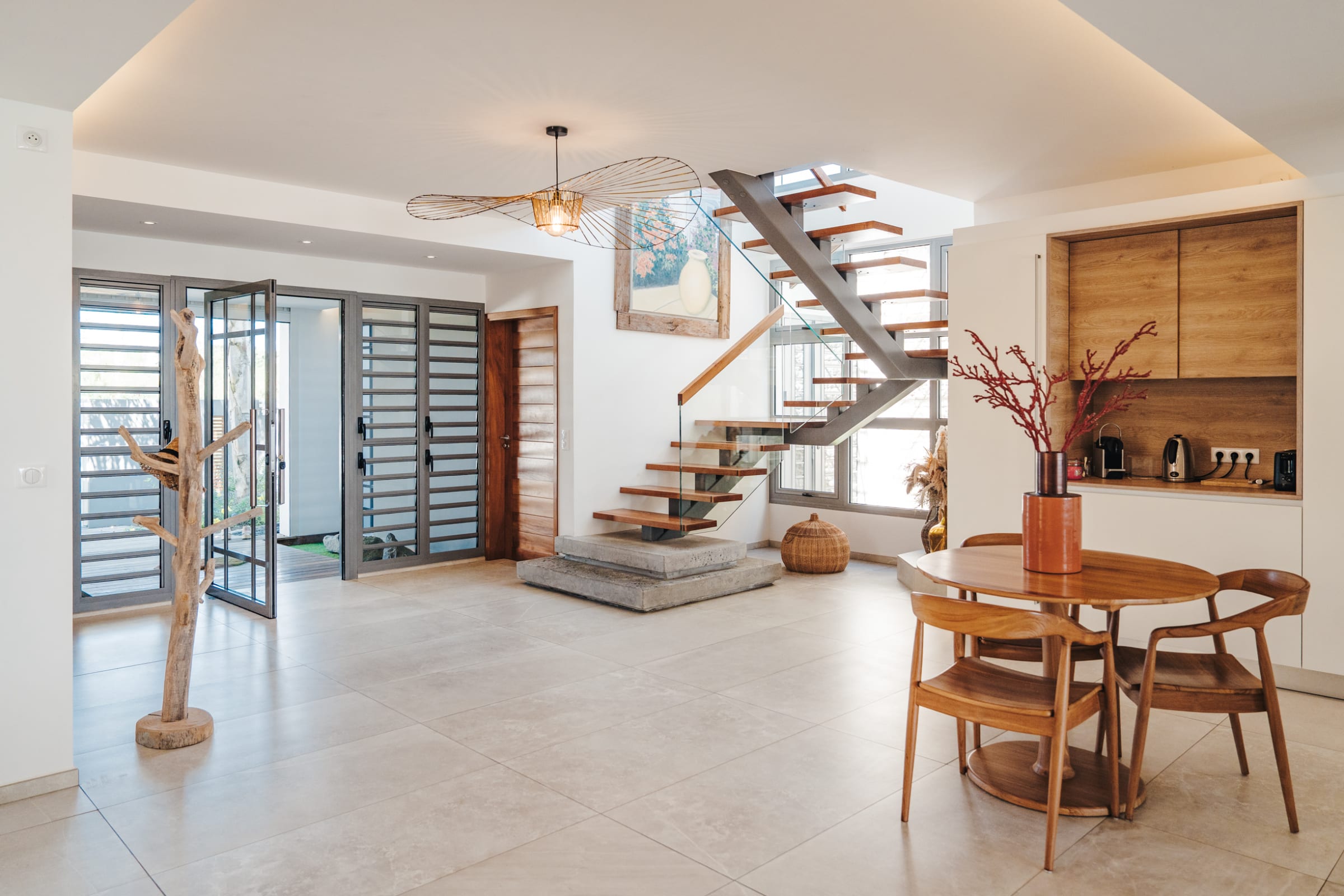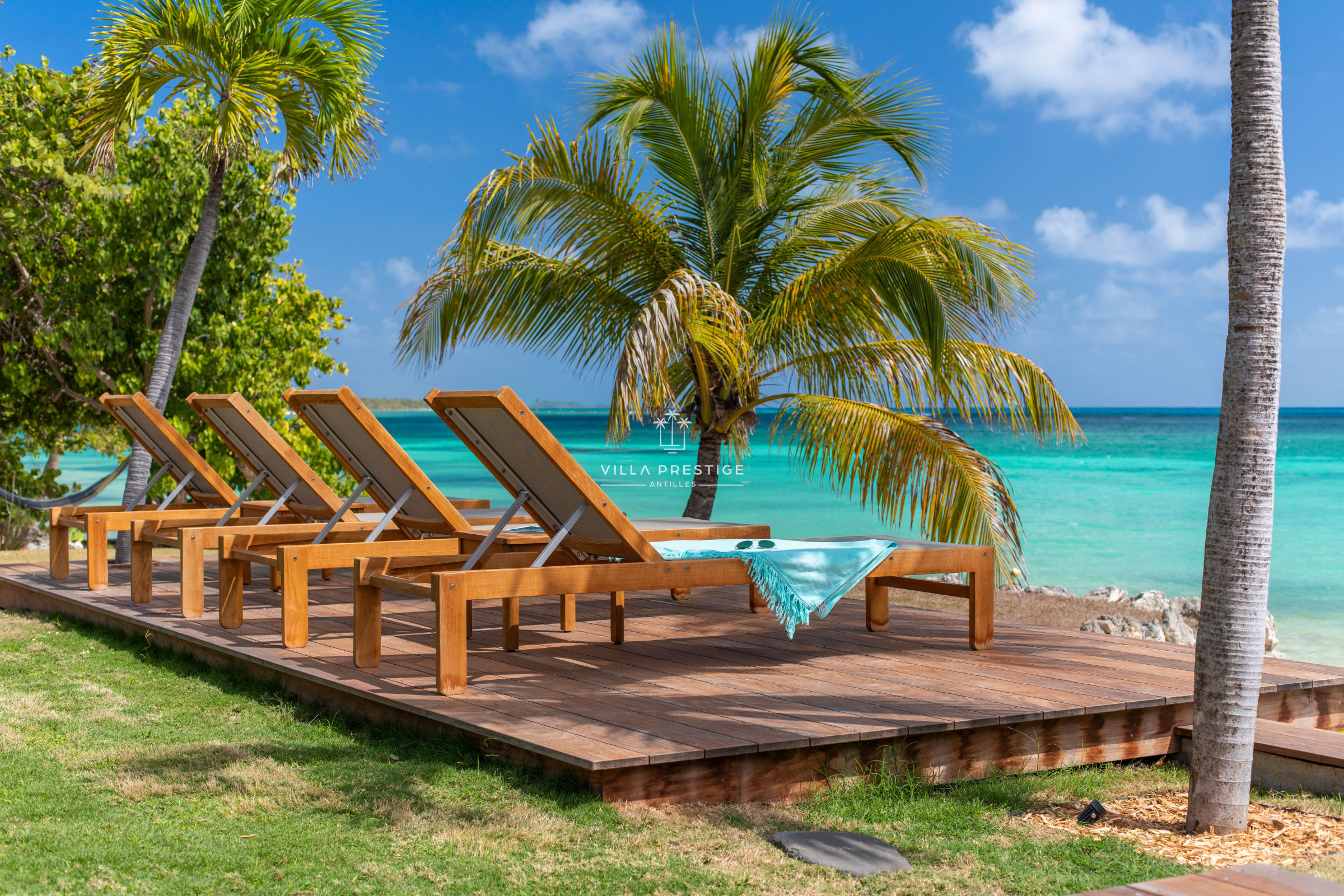 La villa bénéficie d’un jardin ouvert directement sur la plage, avec un majestueux mapou qui offre une ombre bienvenue. La piscine au sel est sécurisée par une barrière amovible. Équipements extérieurs : BBQ gaz, douche extérieure, transats, citerne d’eau. Pour les loisirs : kayak, paddle, plage à vos pieds.