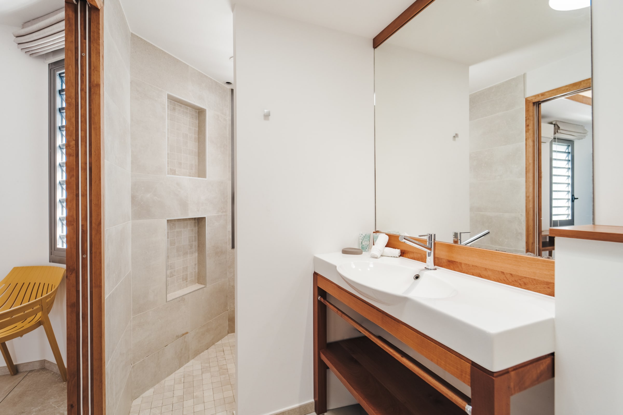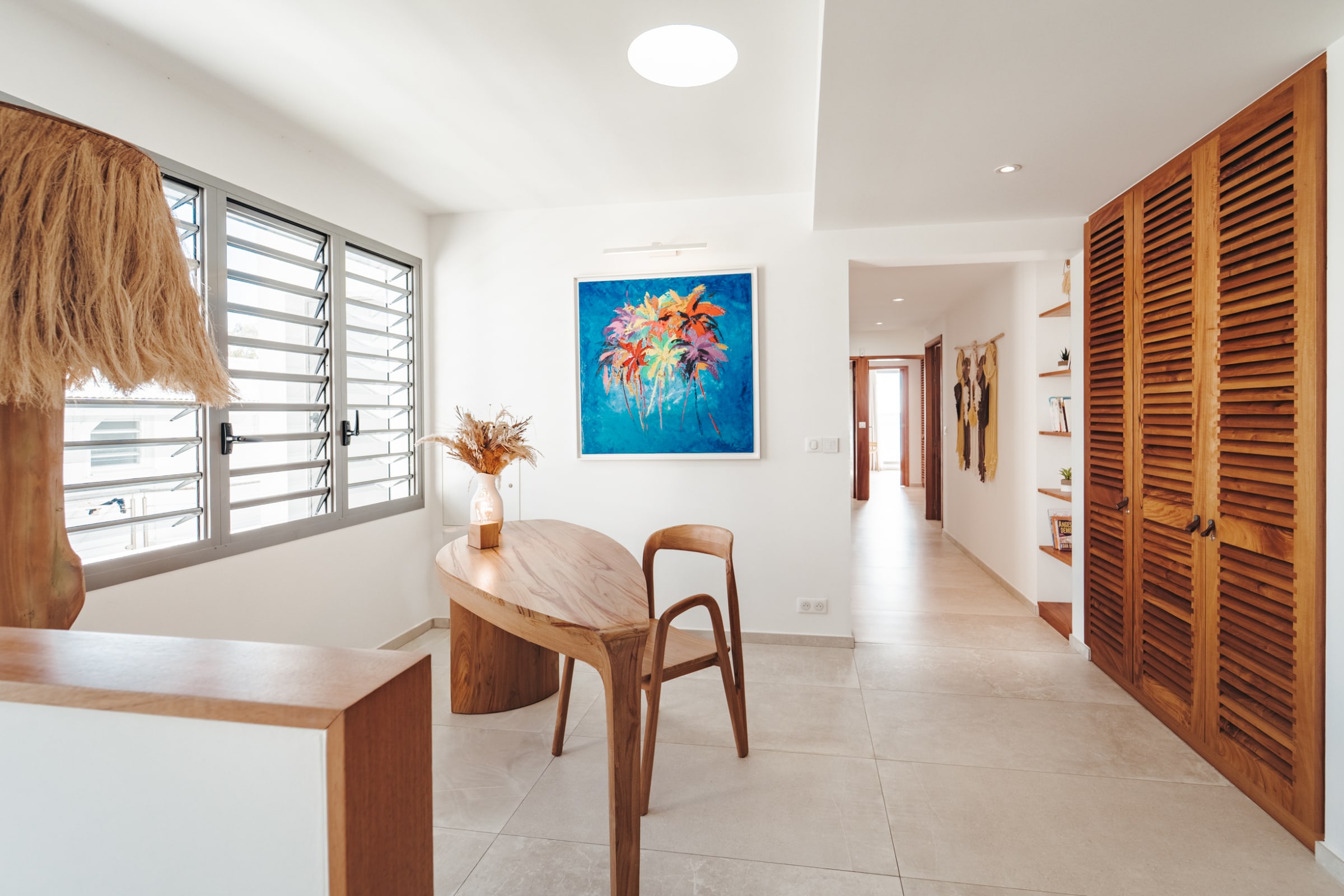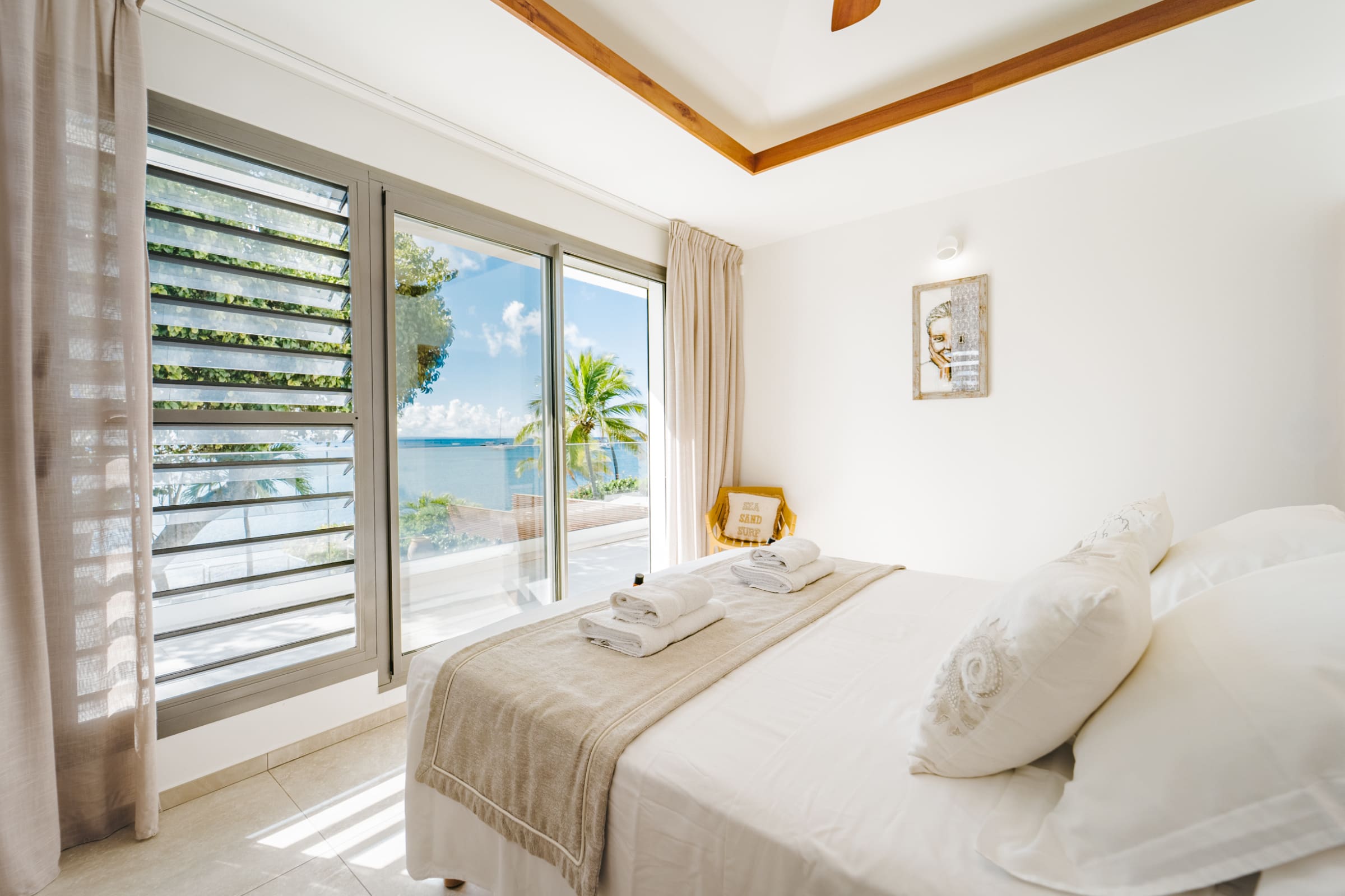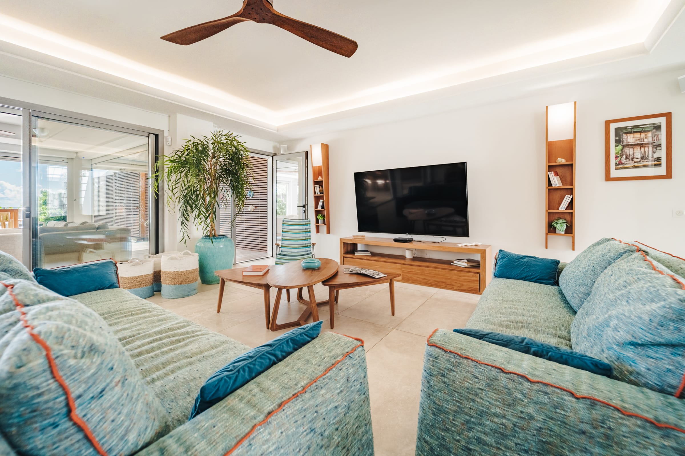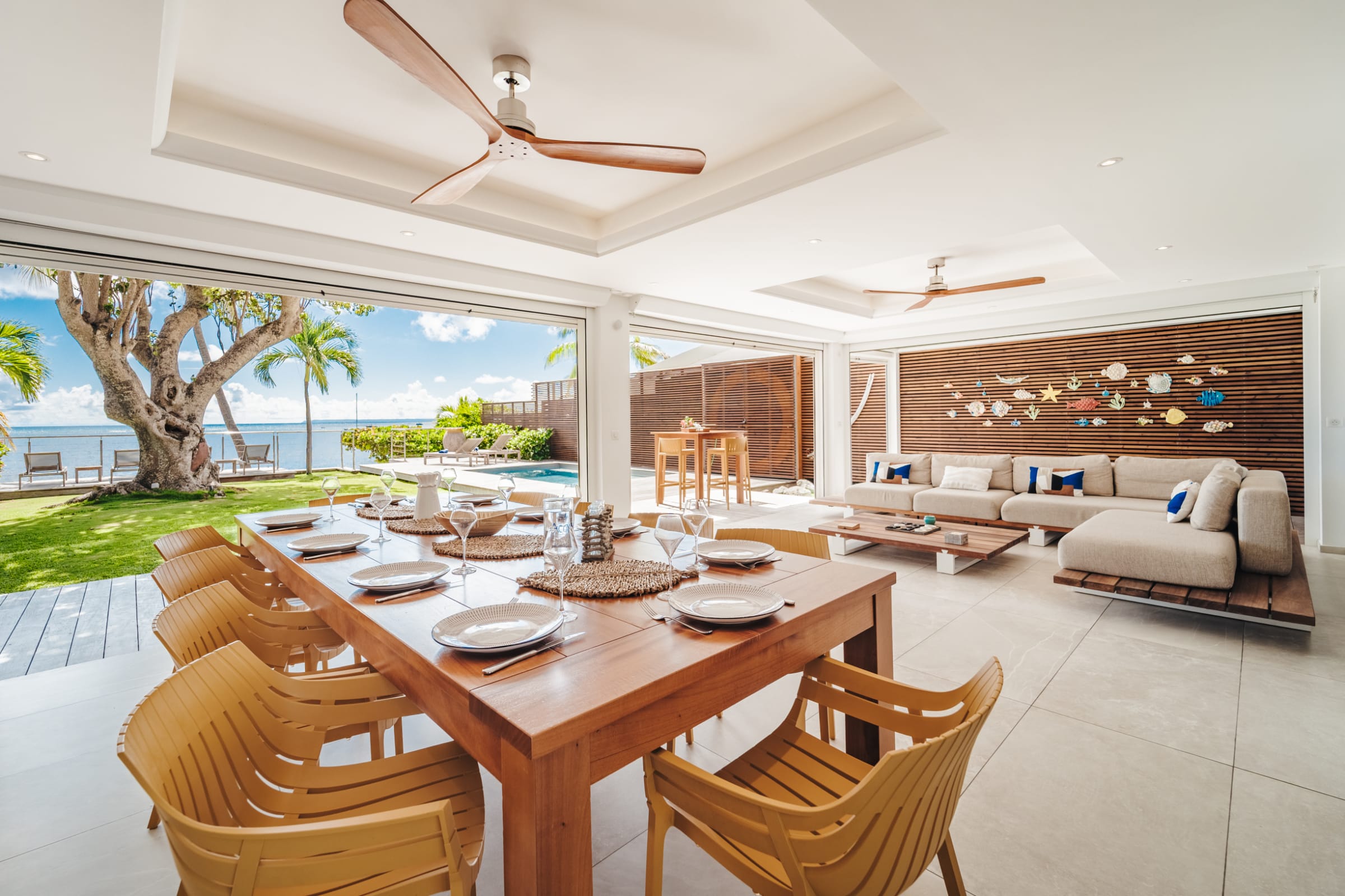 La villa bénéficie d’un jardin ouvert directement sur la plage, avec un majestueux mapou qui offre une ombre bienvenue. La piscine au sel est sécurisée par une barrière amovible. Équipements extérieurs : BBQ gaz, douche extérieure, transats, citerne d’eau. Pour les loisirs : kayak, paddle, plage à vos pieds.