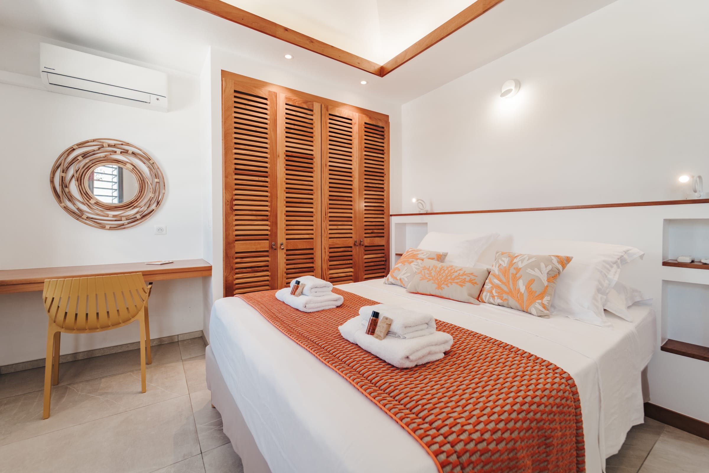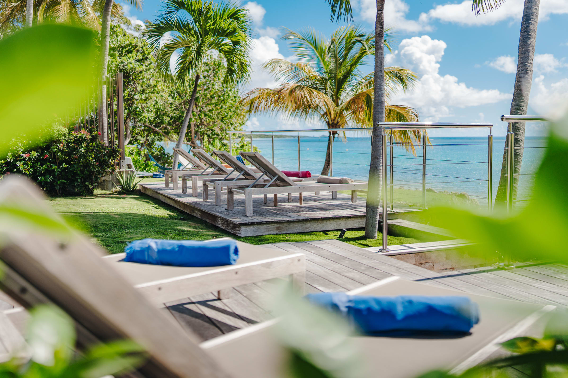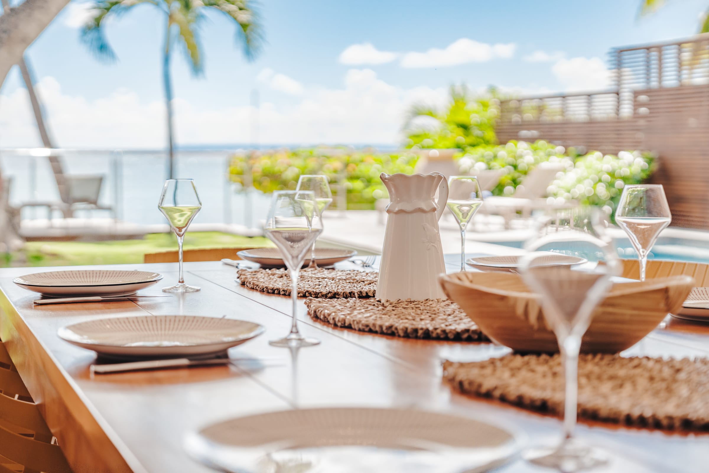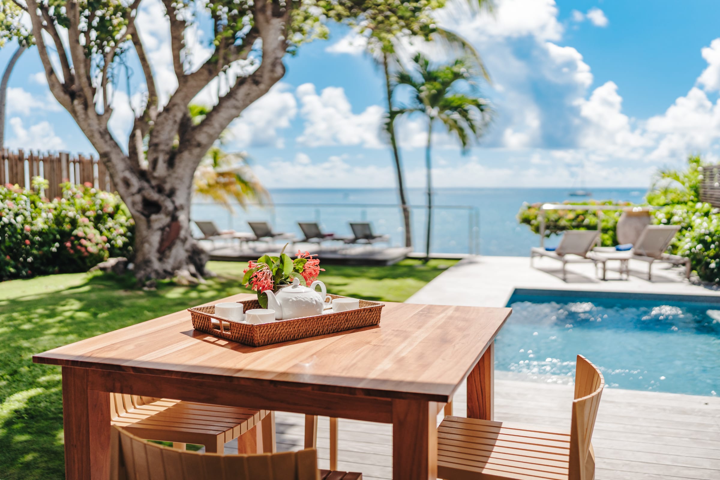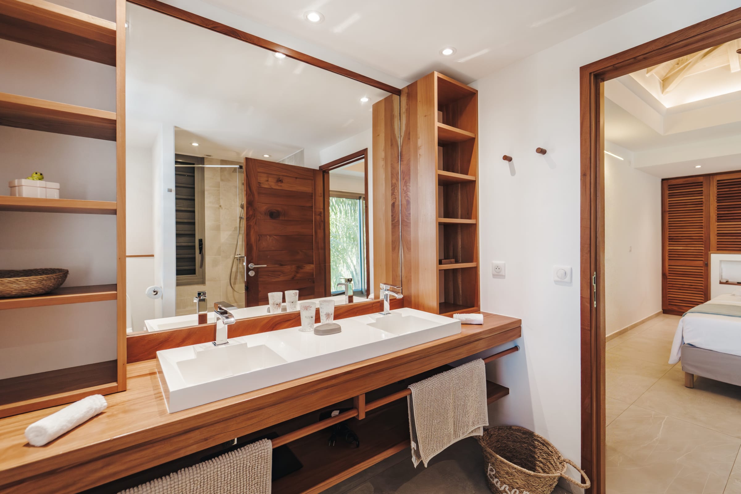La villa bénéficie d’un jardin ouvert directement sur la plage, avec un majestueux mapou qui offre une ombre bienvenue. La piscine au sel est sécurisée par une barrière amovible. Équipements extérieurs : BBQ gaz, douche extérieure, transats, citerne d’eau. Pour les loisirs : kayak, paddle, plage à vos pieds.