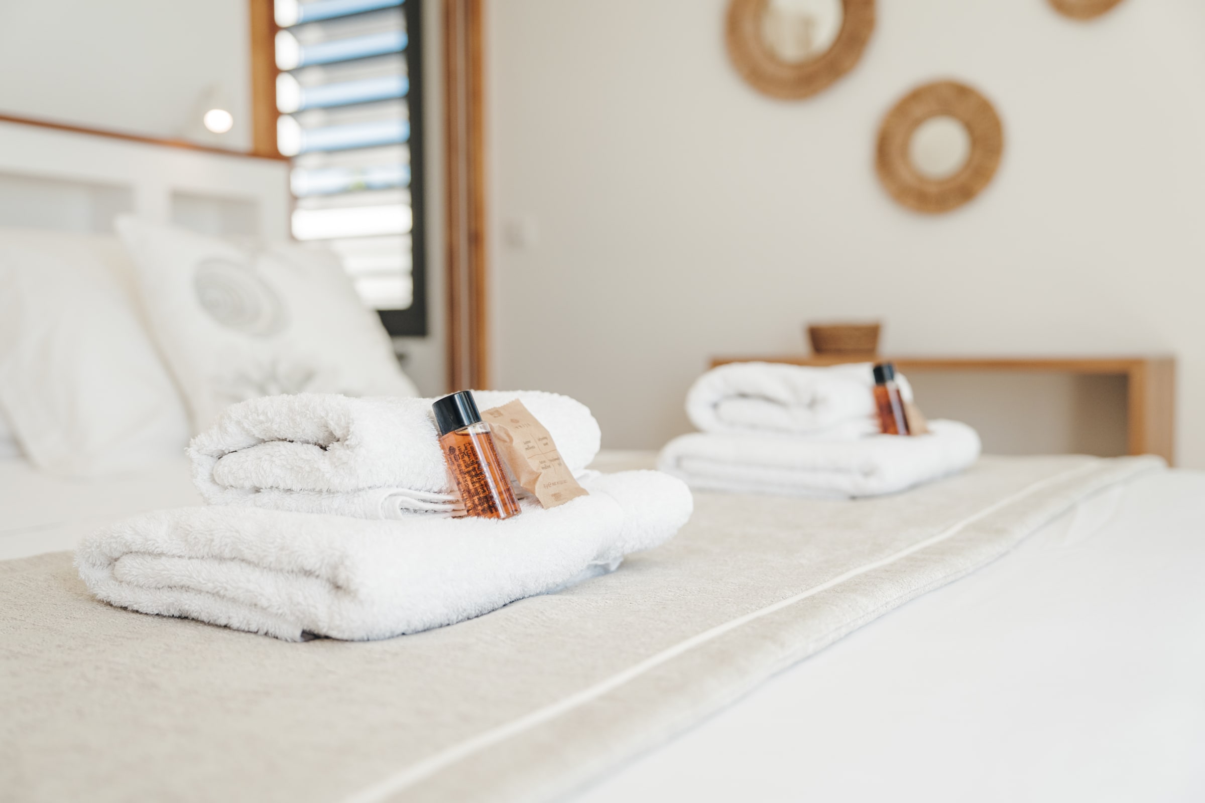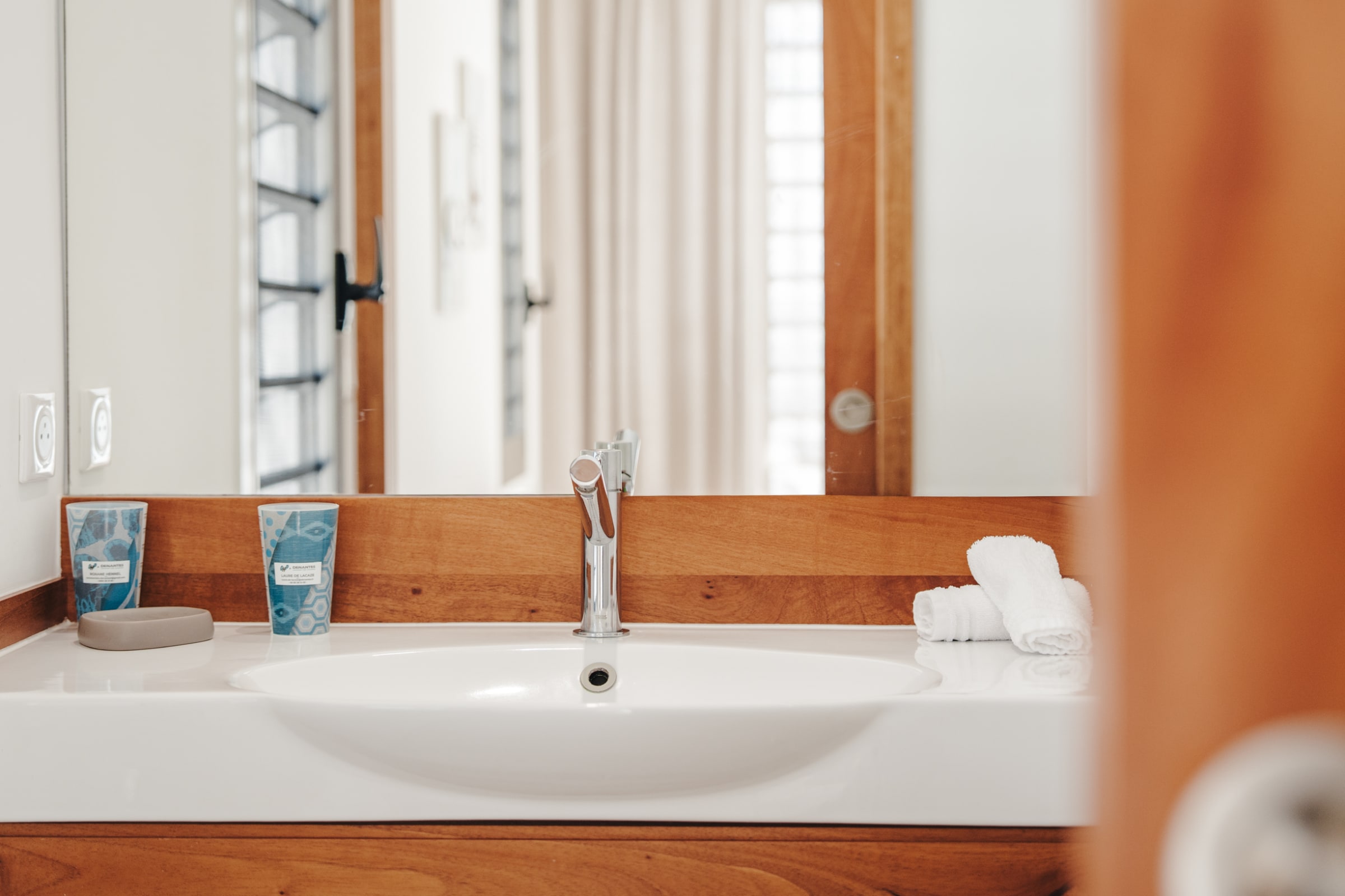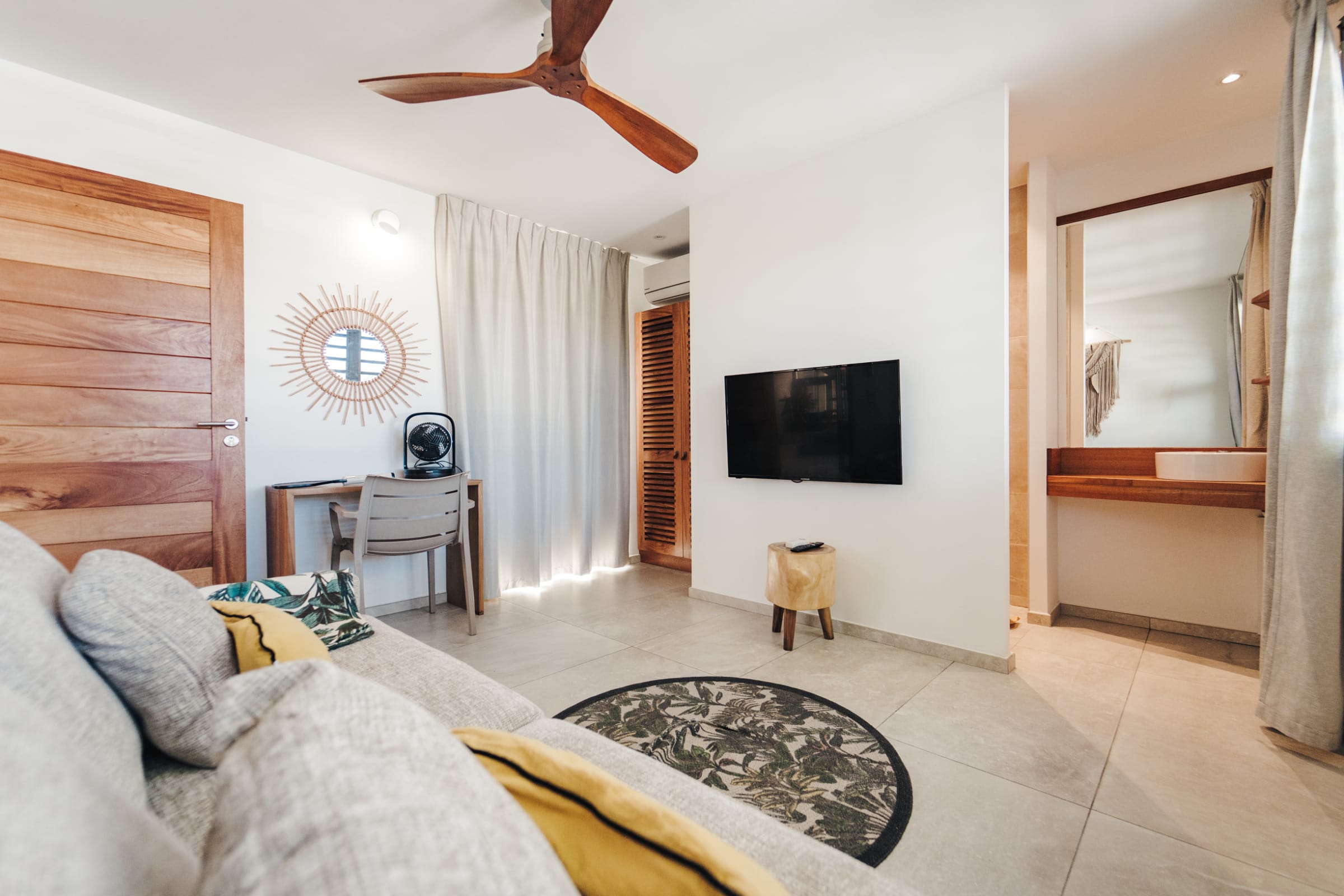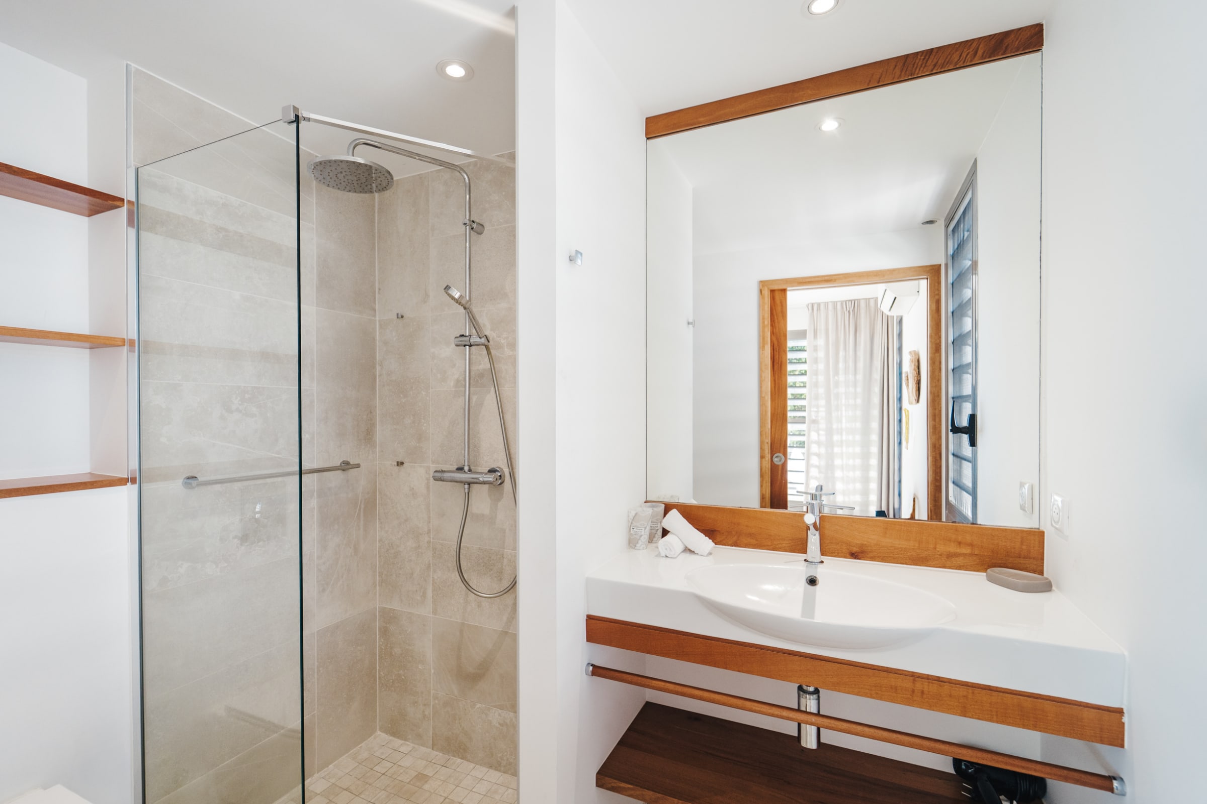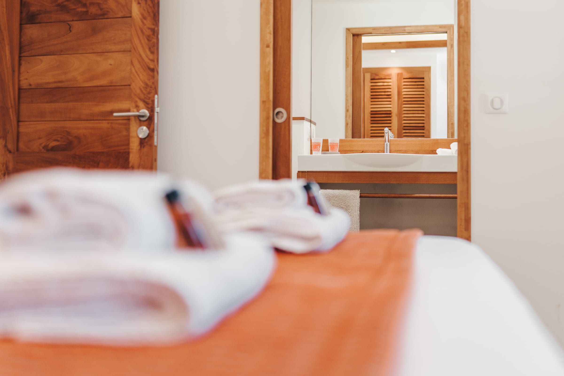 La villa bénéficie d’un jardin ouvert directement sur la plage, avec un majestueux mapou qui offre une ombre bienvenue. La piscine au sel est sécurisée par une barrière amovible. Équipements extérieurs : BBQ gaz, douche extérieure, transats, citerne d’eau. Pour les loisirs : kayak, paddle, plage à vos pieds.