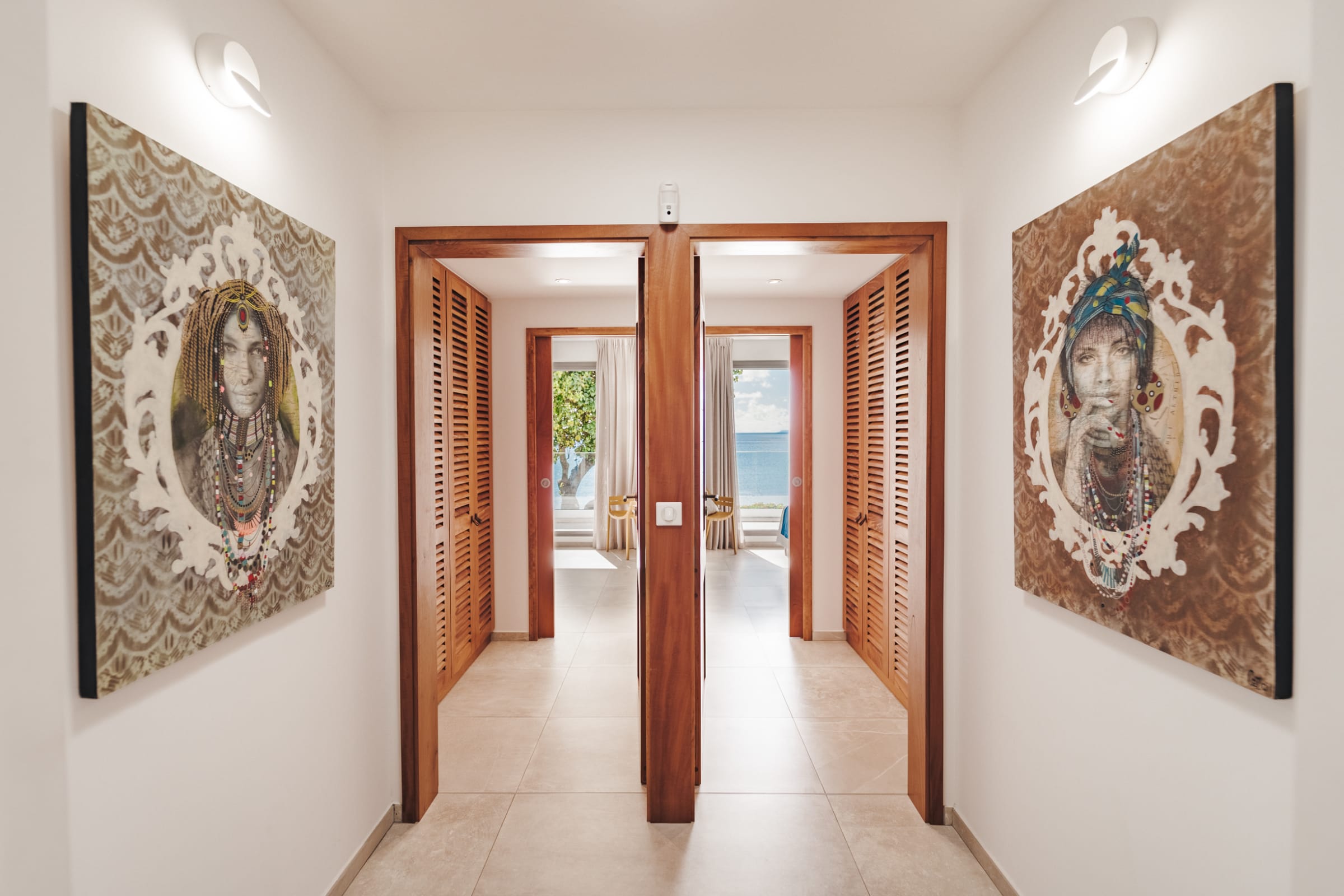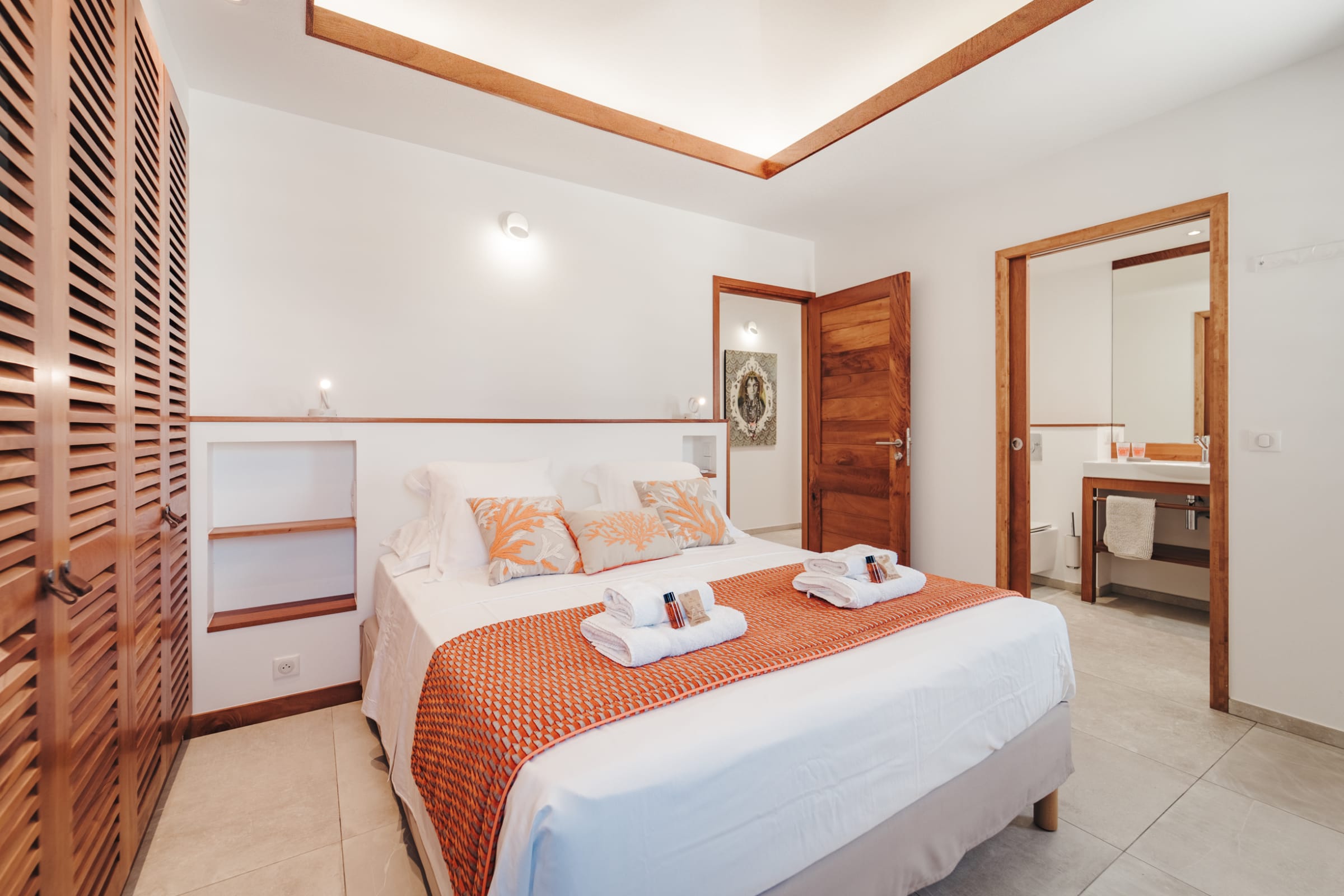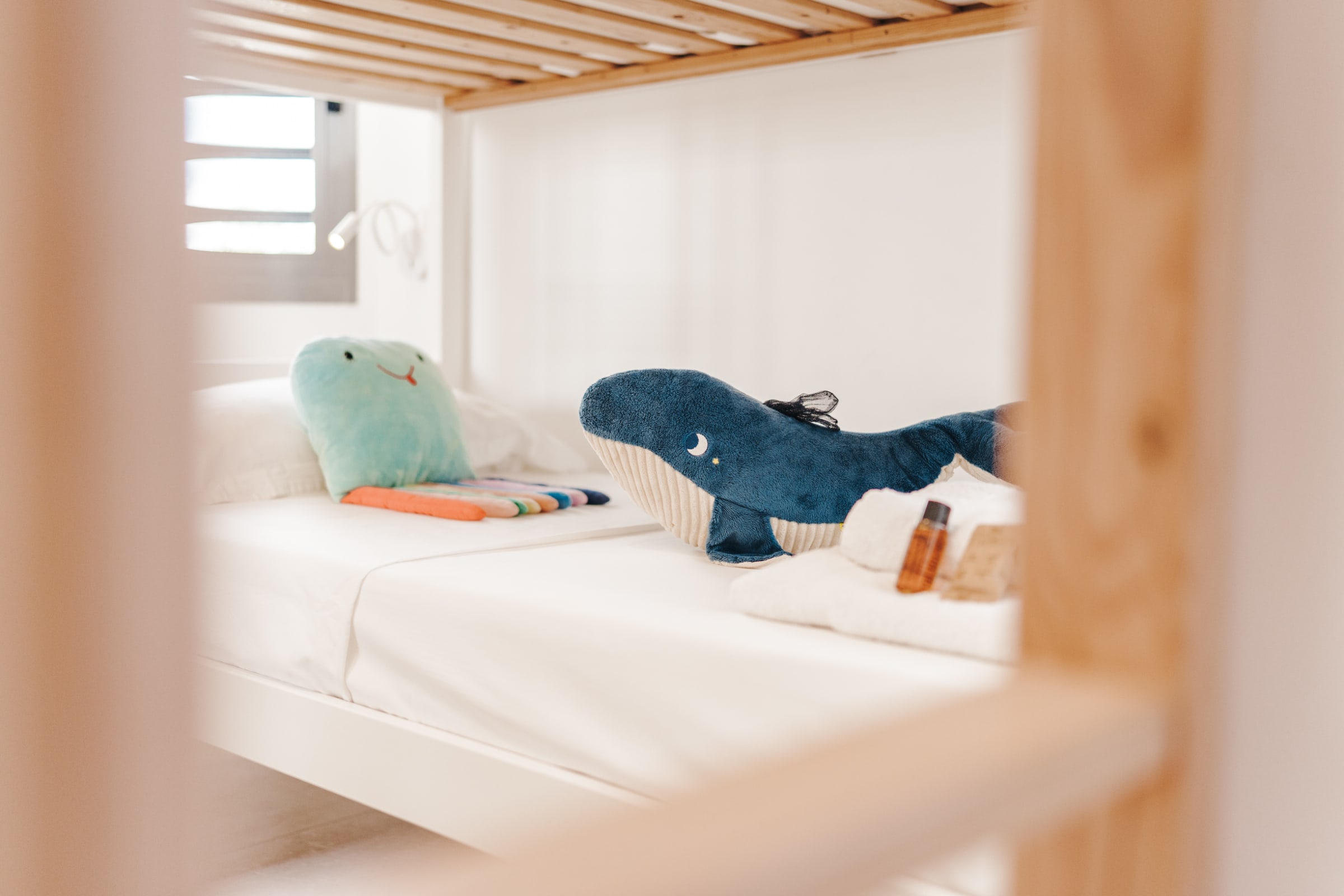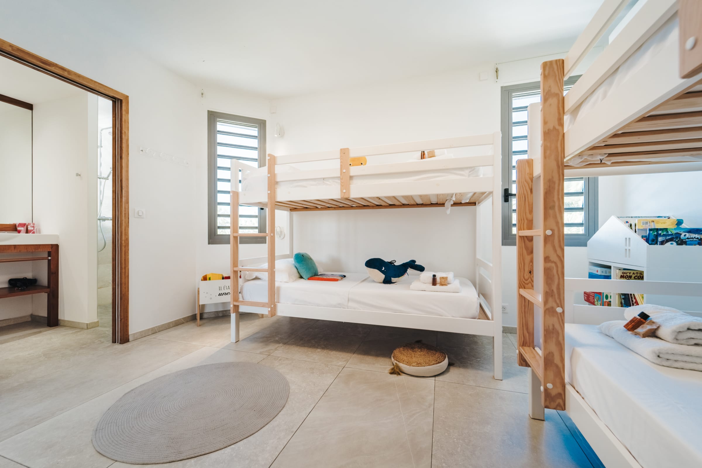 Les 6 chambres sont situées à l’étage. Chacune dispose de sa salle de bain attenante, de la climatisation et brasseur d’air ainsi qu’un dressing. La chambre 6 est dédiée aux enfants avec 4 couchages en lits superposés.