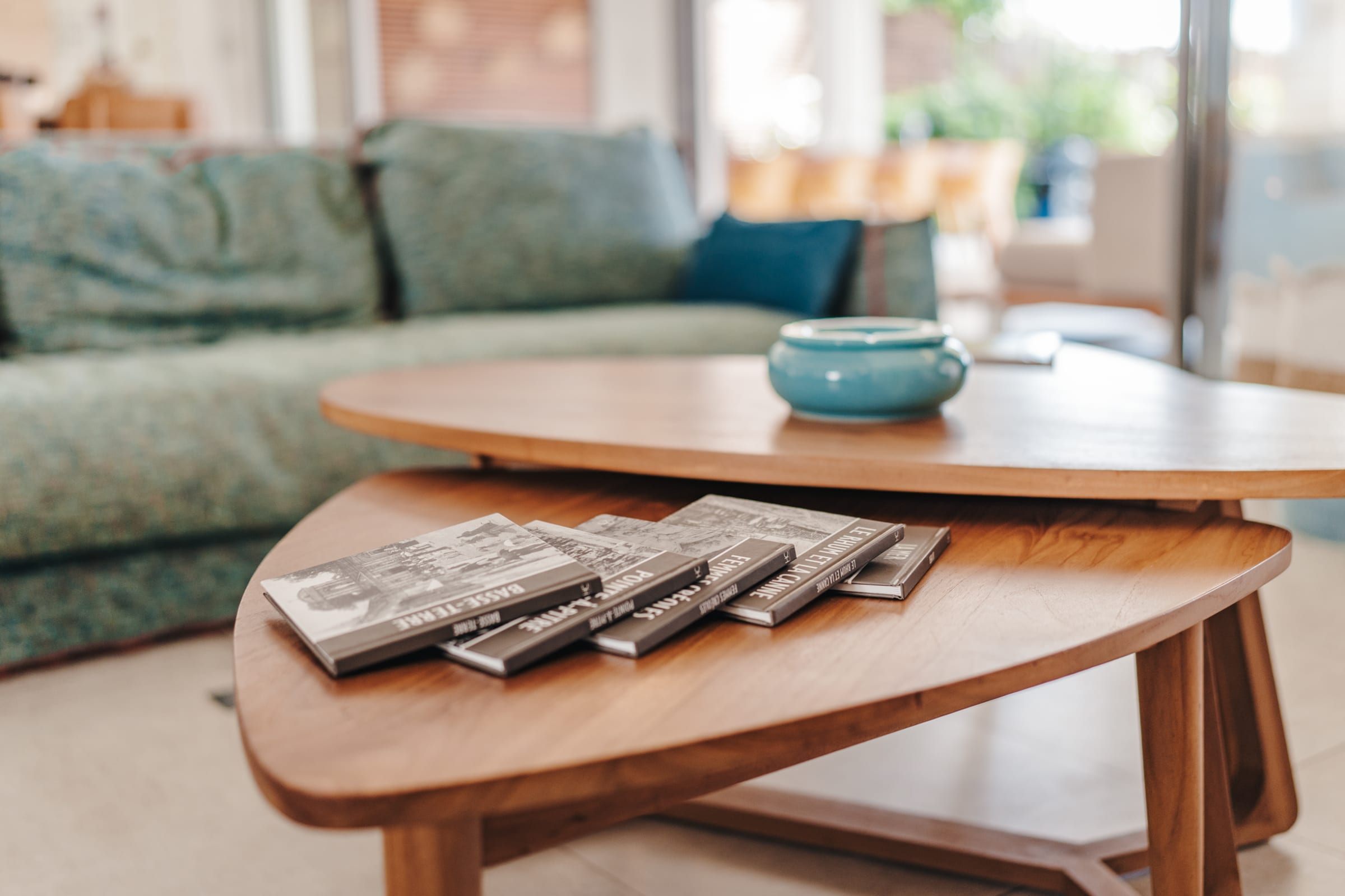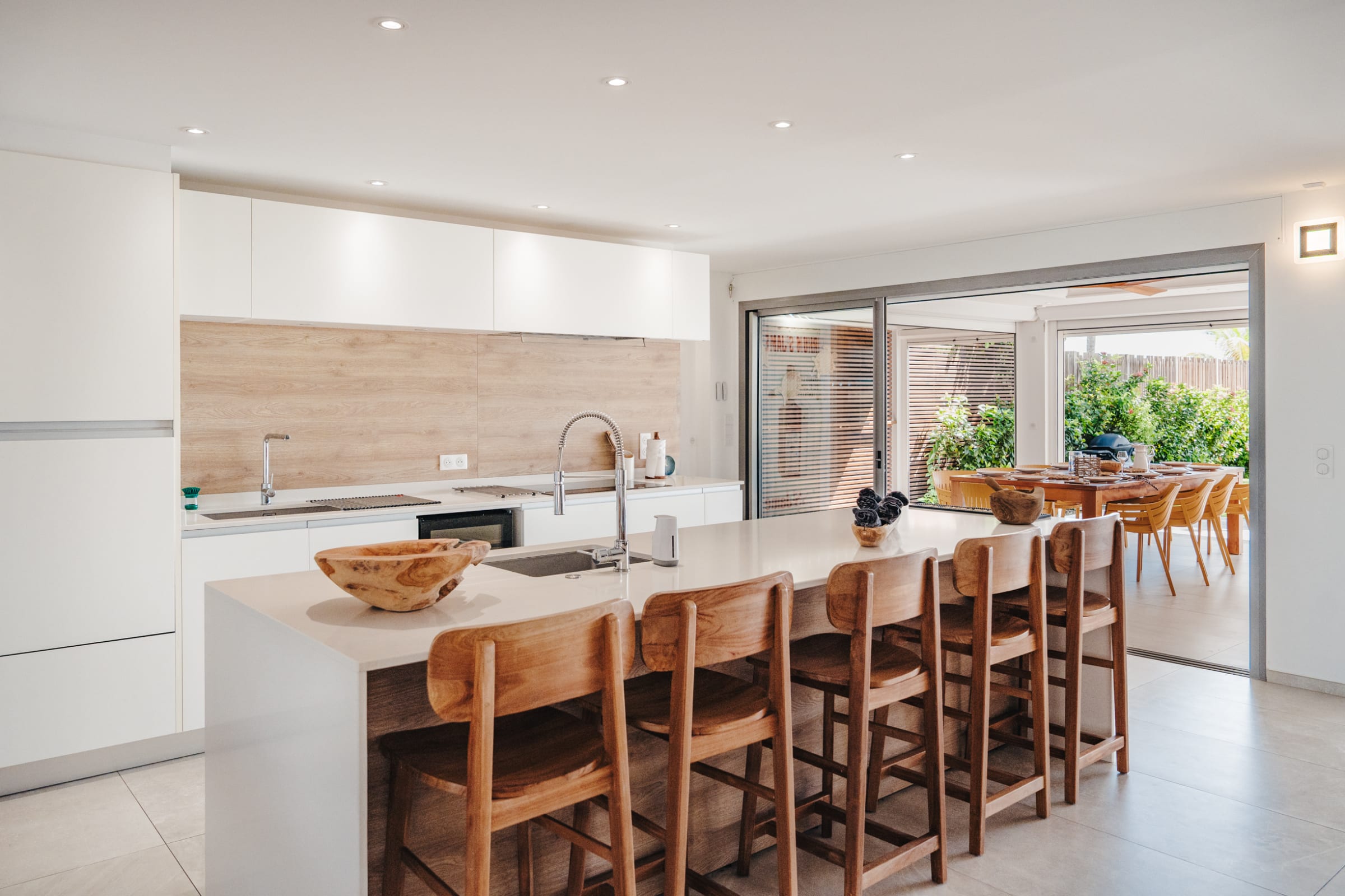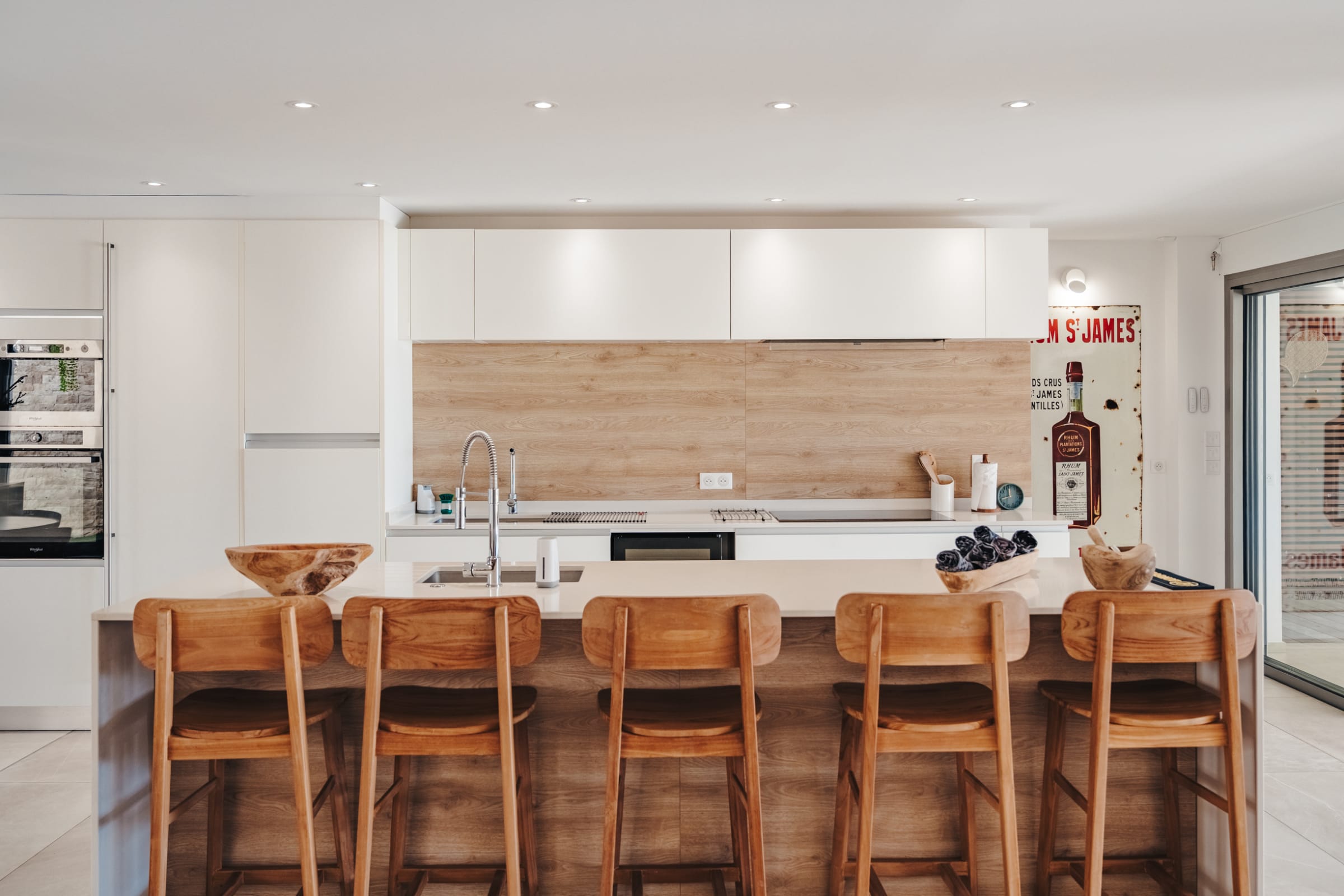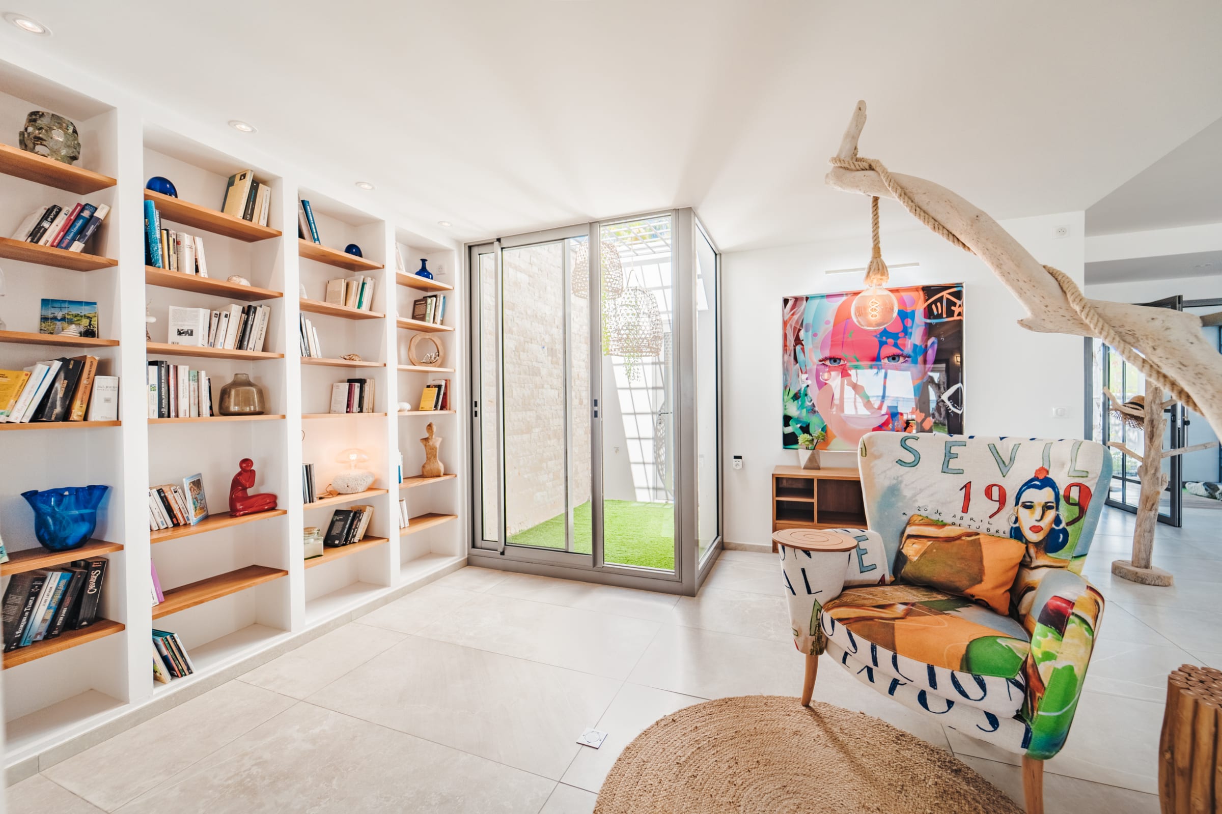Au rez-de-chaussée, la villa s’ouvre sur un grand espace à vivre lumineux et convivial : coin lecture, salon TV avec deux canapés, cuisine entièrement équipée avec îlot central. Deux grandes baies vitrées donnent sur la terrasse couverte, offrant un second salon extérieur idéal pour les cafés du matin ou les apéritifs en fin de journée. Une grande table extérieure permet de partager les repas tous ensemble.