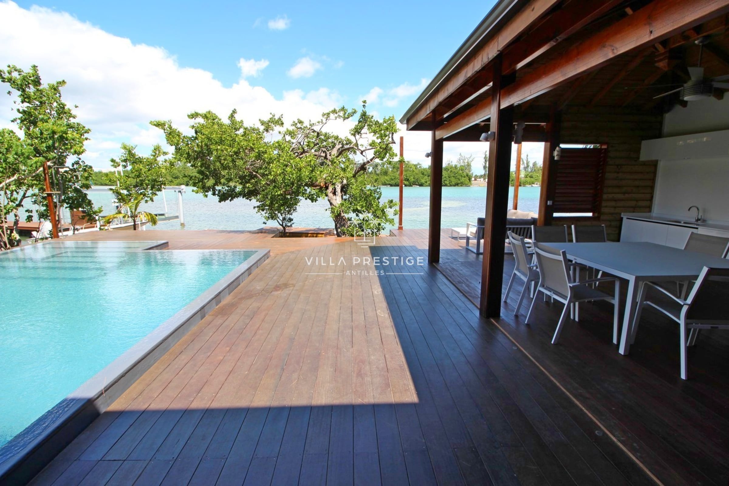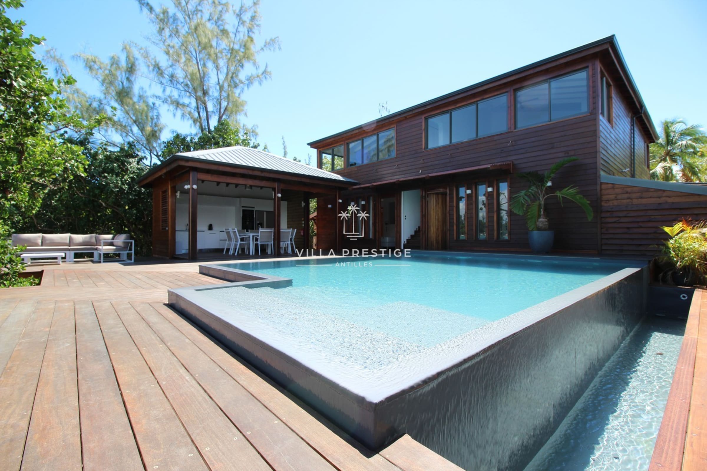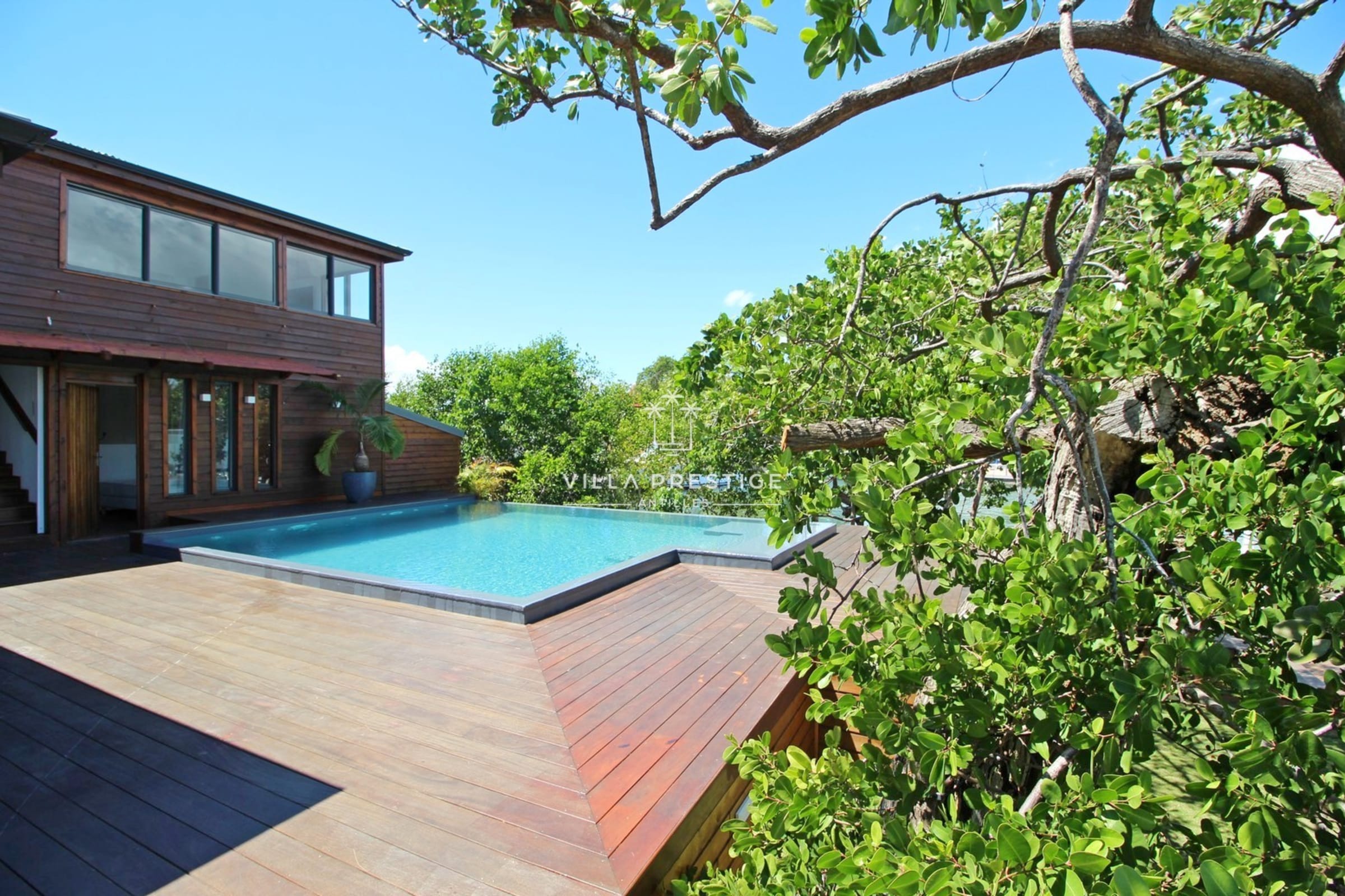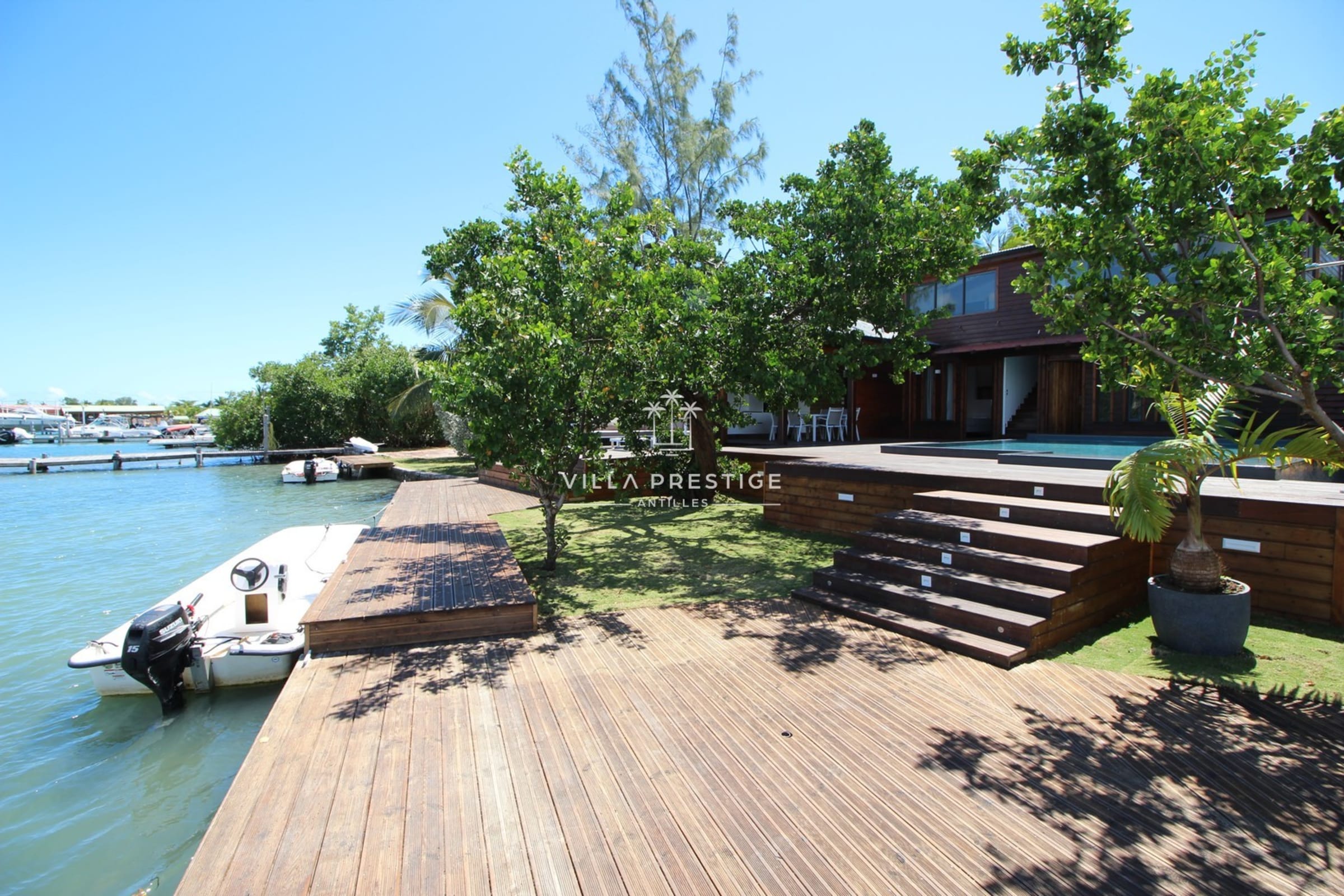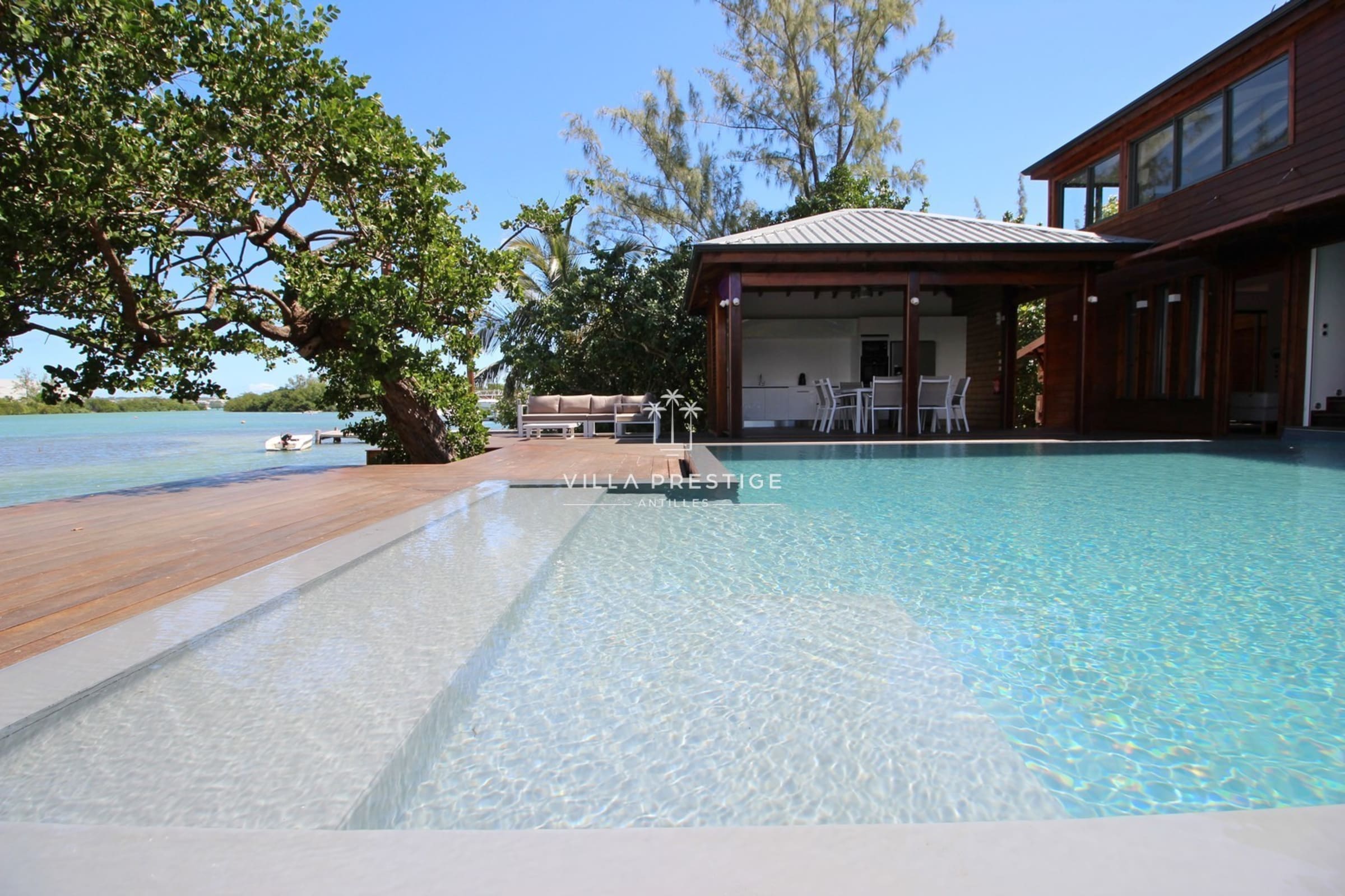 La villa est entourée d’un grand jardin tropical avec cocotiers, deck en bois, douche extérieure, salon lounge et transats. Une piscine à débordement au sel invite à la baignade avec vue imprenable sur la Basse-Terre. Activités incluses : paddle, kayak, snorkeling. Un petit bateau à moteur est mis à disposition pour les traversées depuis le ponton (3 minutes).