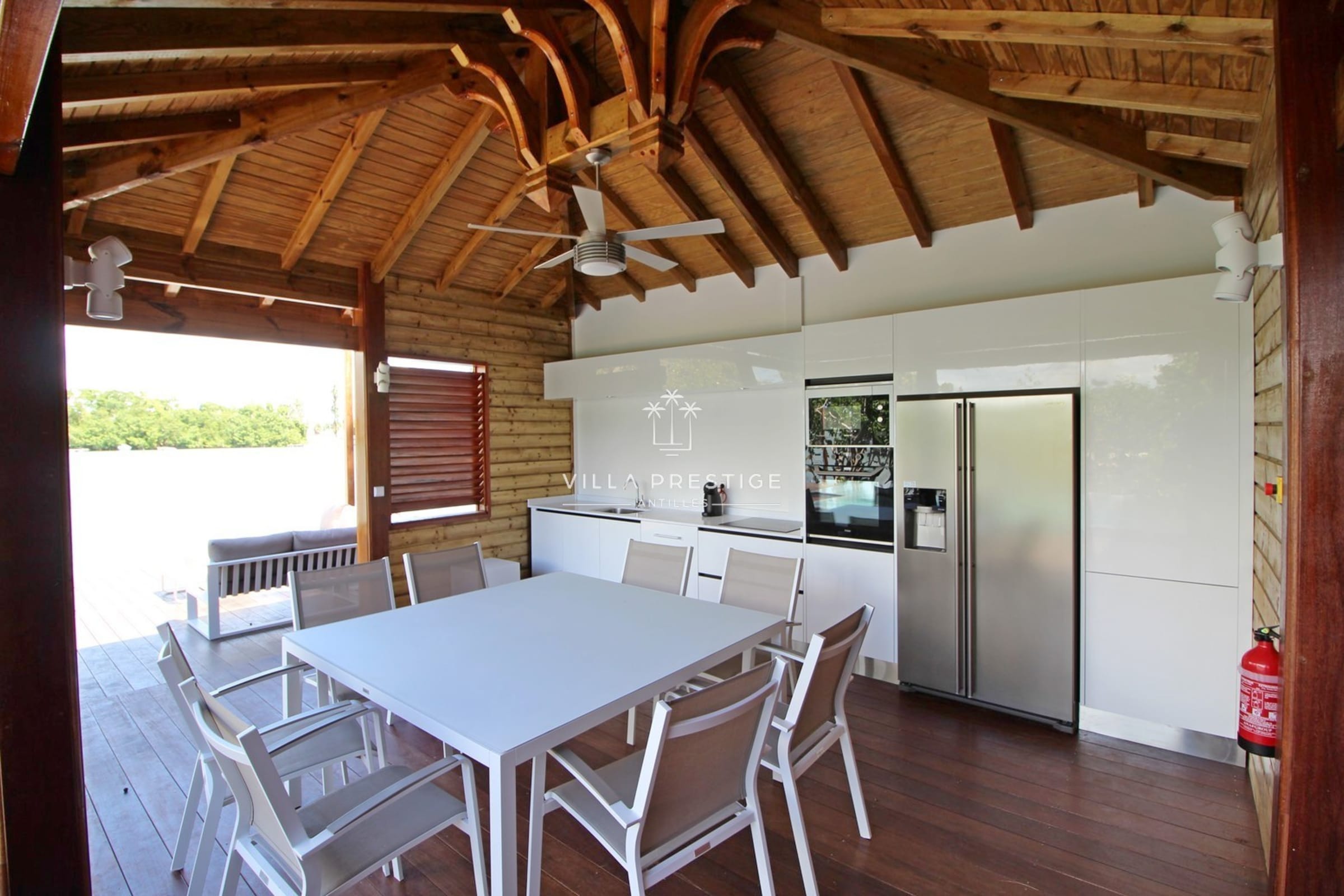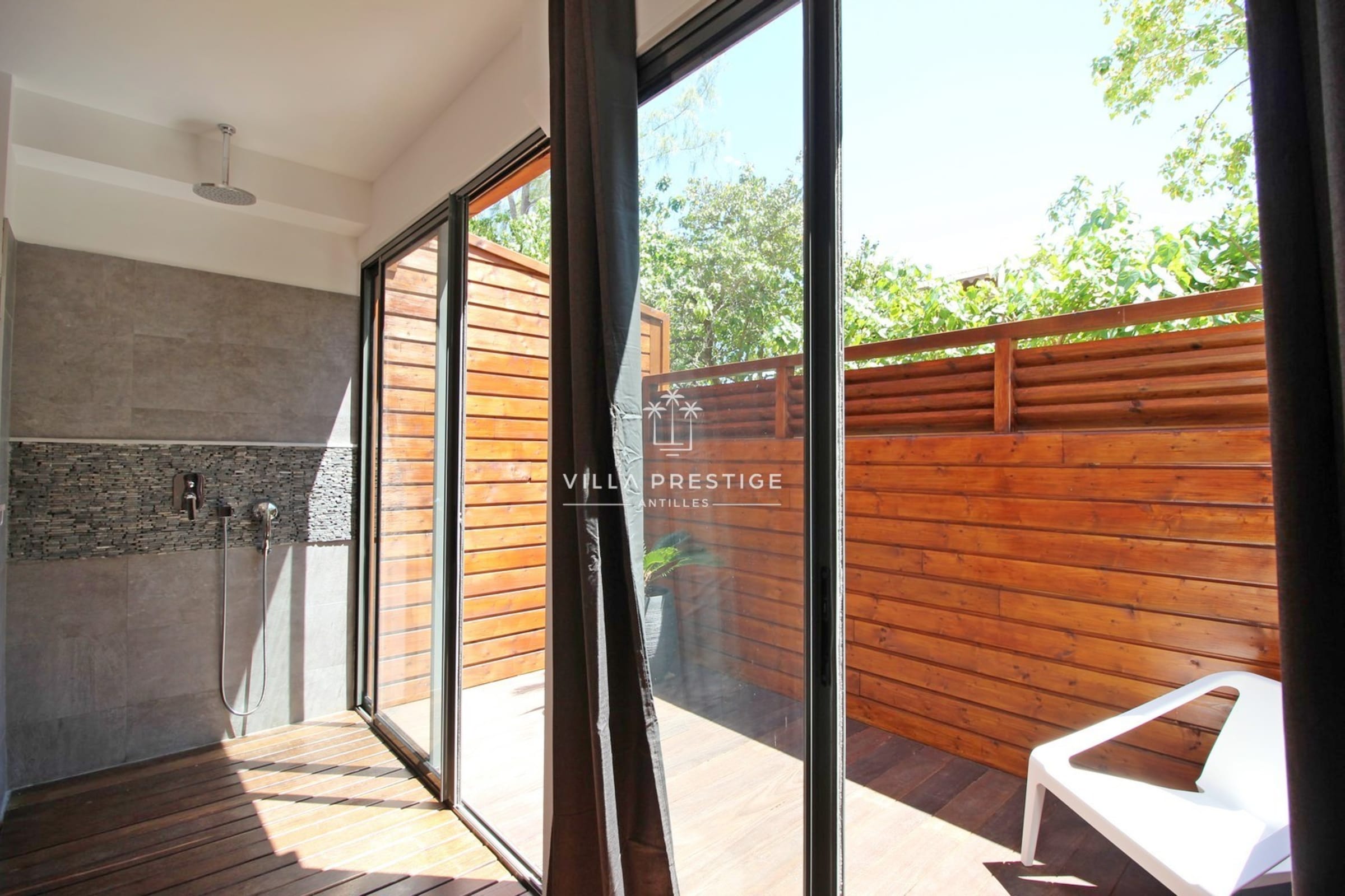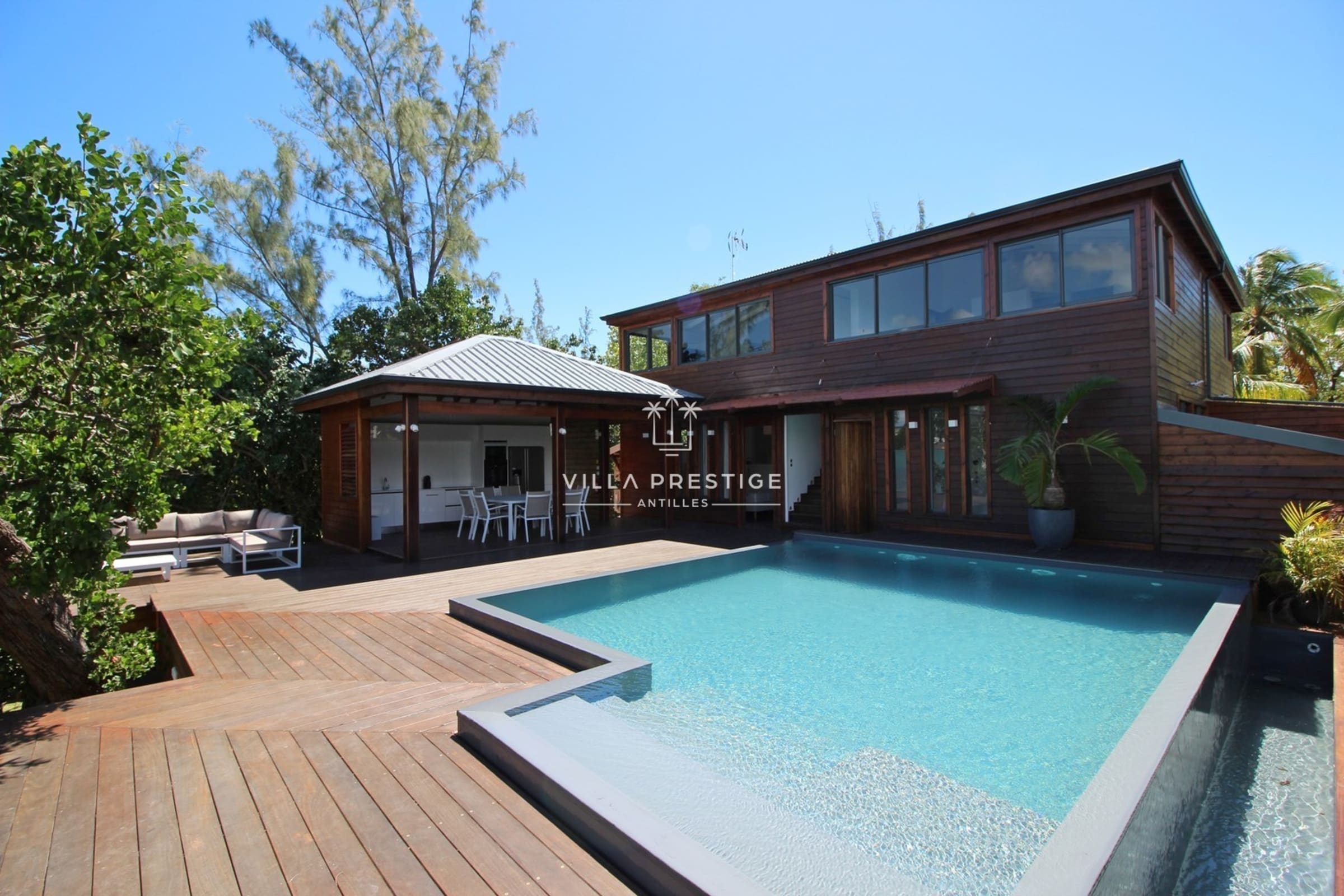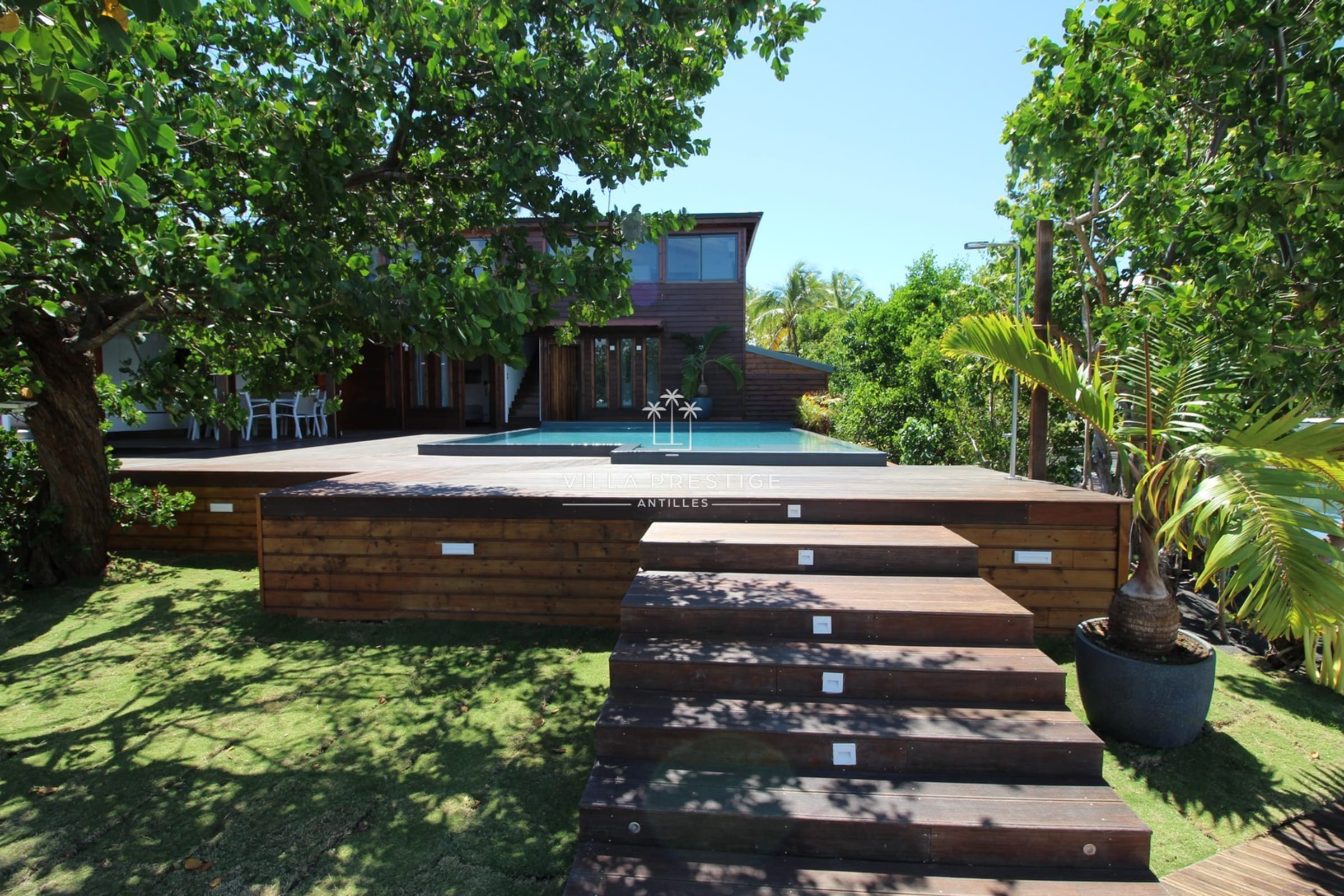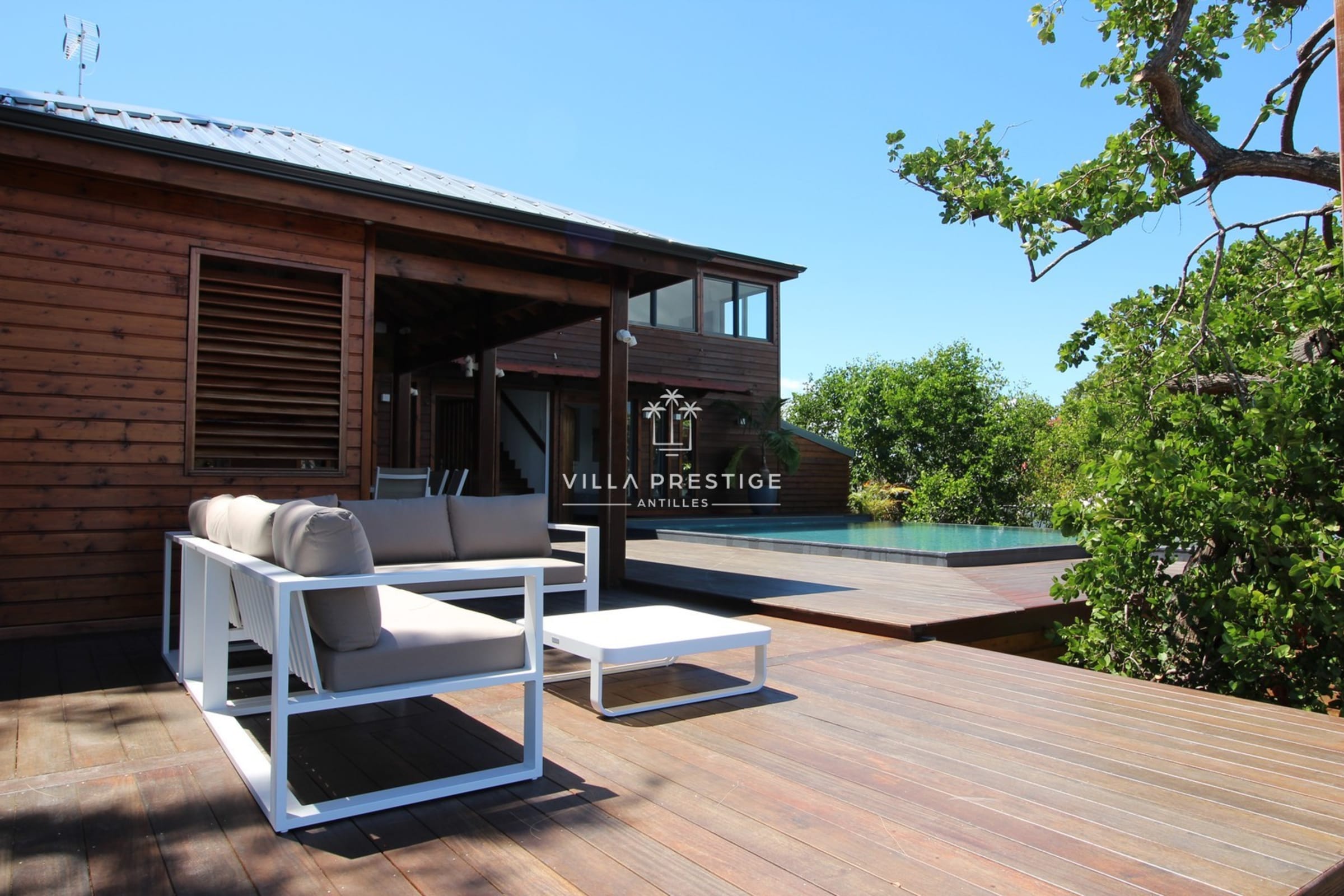 La villa est entourée d’un grand jardin tropical avec cocotiers, deck en bois, douche extérieure, salon lounge et transats. Une piscine à débordement au sel invite à la baignade avec vue imprenable sur la Basse-Terre. Activités incluses : paddle, kayak, snorkeling. Un petit bateau à moteur est mis à disposition pour les traversées depuis le ponton (3 minutes).