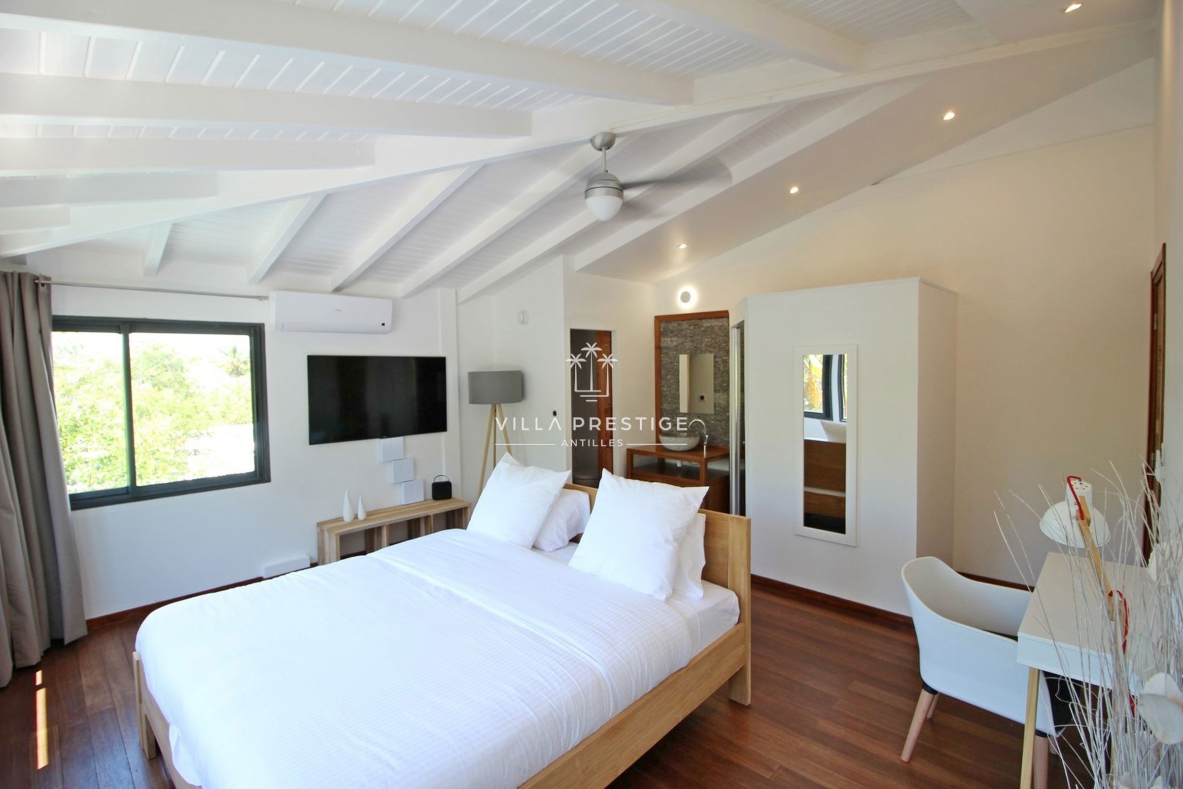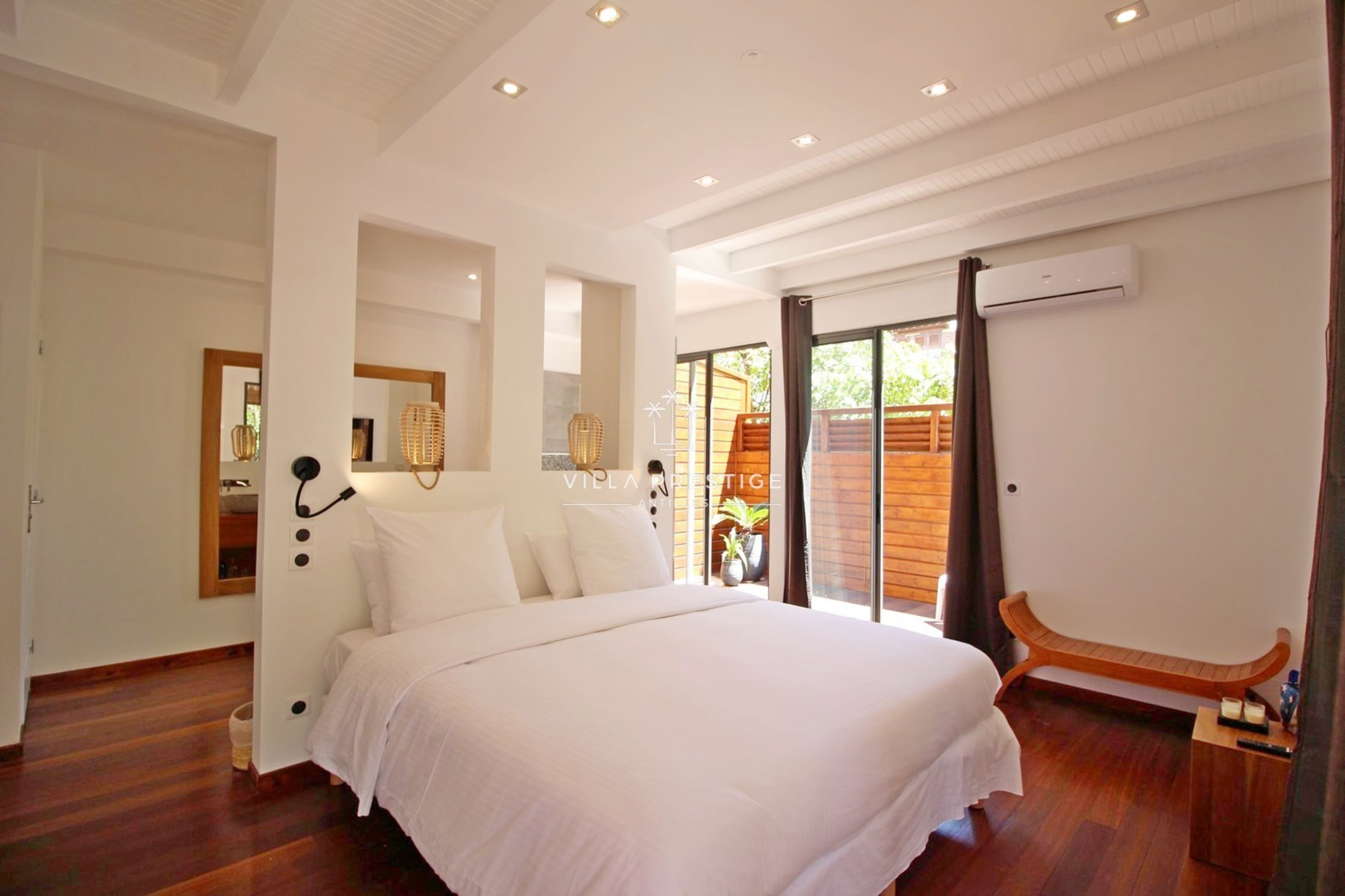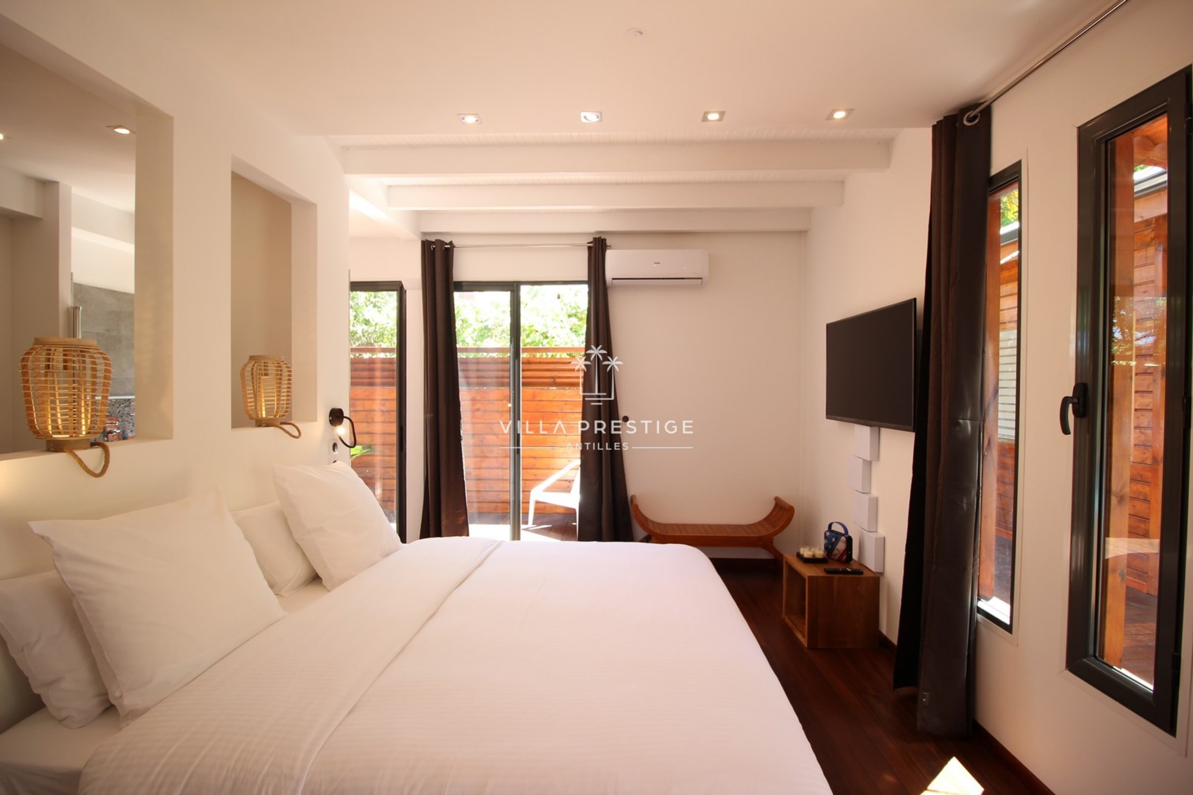 La villa comprend 2 suites climatisées avec salles de bain attenantes, toutes offrant une vue dégagée sur la mer et la végétation :